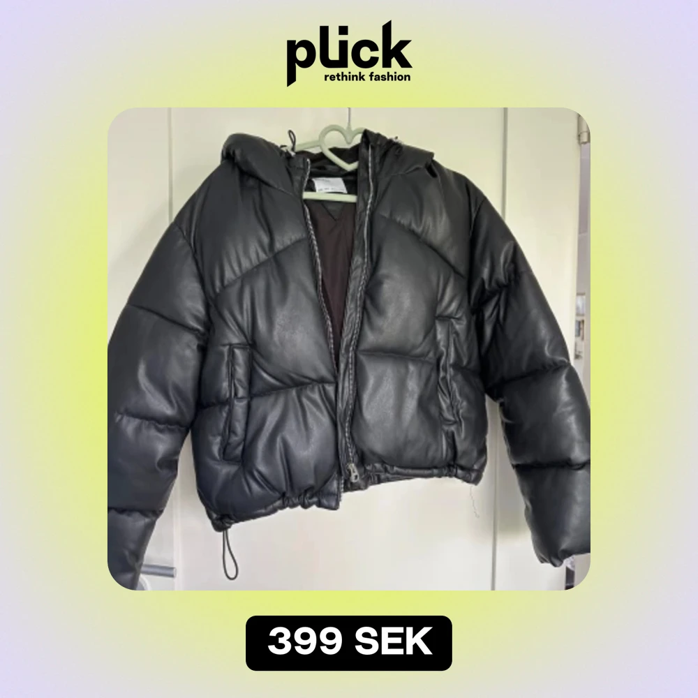 Svart pufferjacka med luva i skinnimitation storlek S från Bershka. Dragkedja som stängning, öppna fickor. Dragsko i midjan och luvan. Inga defekter, använd fåtal gånger. Är i mycket bra skick.