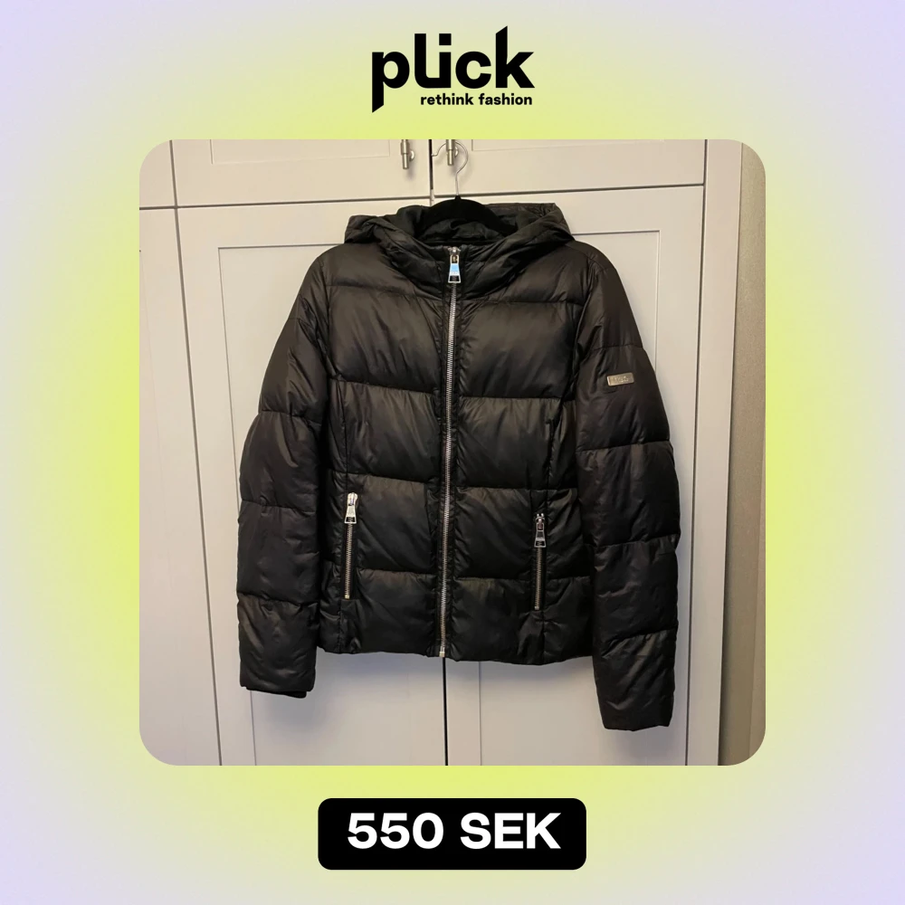 Säljer en svart pufferjacka i mycket bra skick. Den har en praktisk huva och dragkedja framtill.