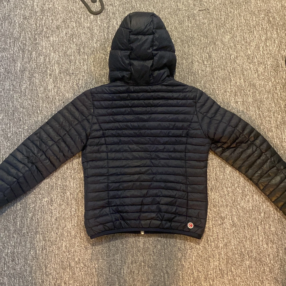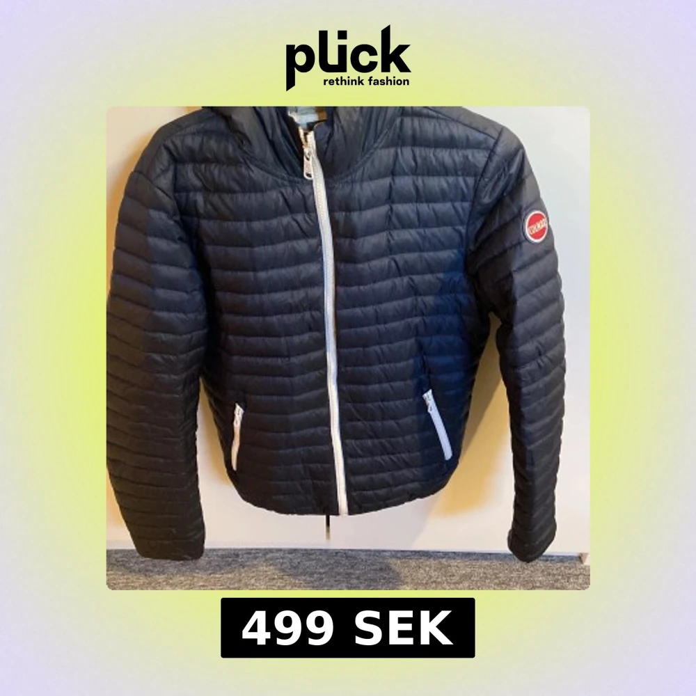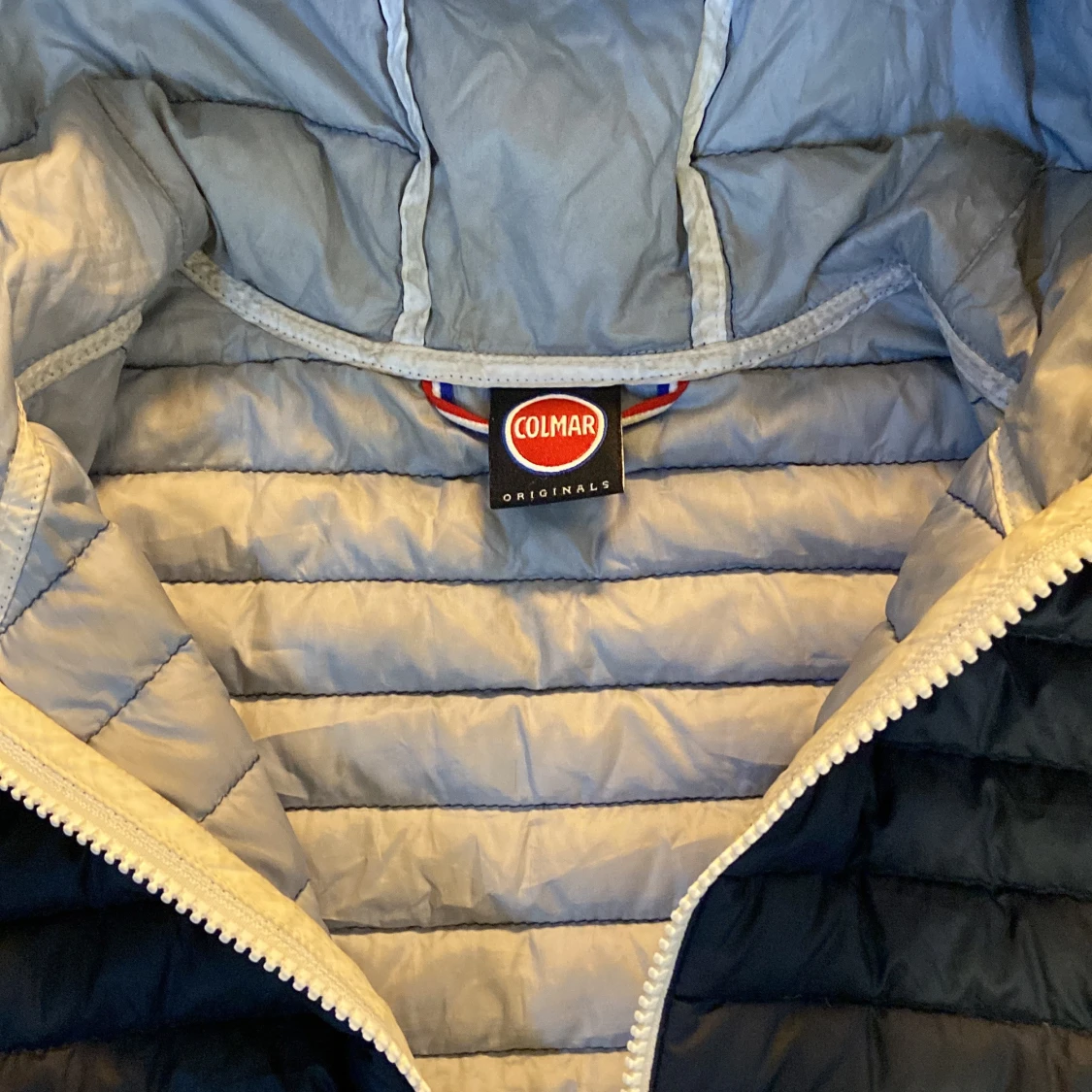Säljer en pufferjacka från Colmar med huva och vita dragkedjor. Jackan har quiltad design, två fickor med dragkedja och en snygg logga på ärmen. Perfekt för kyliga dagar och riktigt skön att ha på sig.
