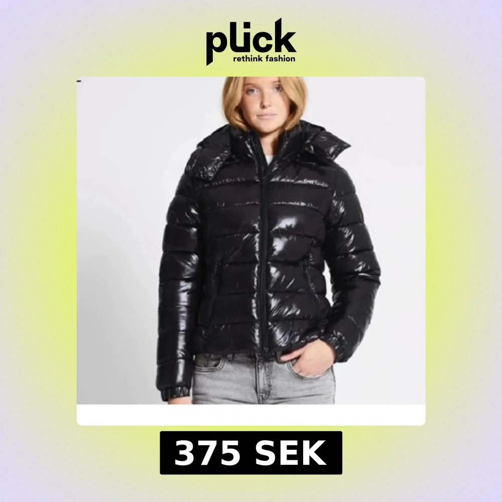Snygg svart pufferjacka med glansig yta och dragkedja framtill. Jackan har en hög krage och långa ärmar, perfekt för kyliga dagar. Den är både stilren och praktisk.