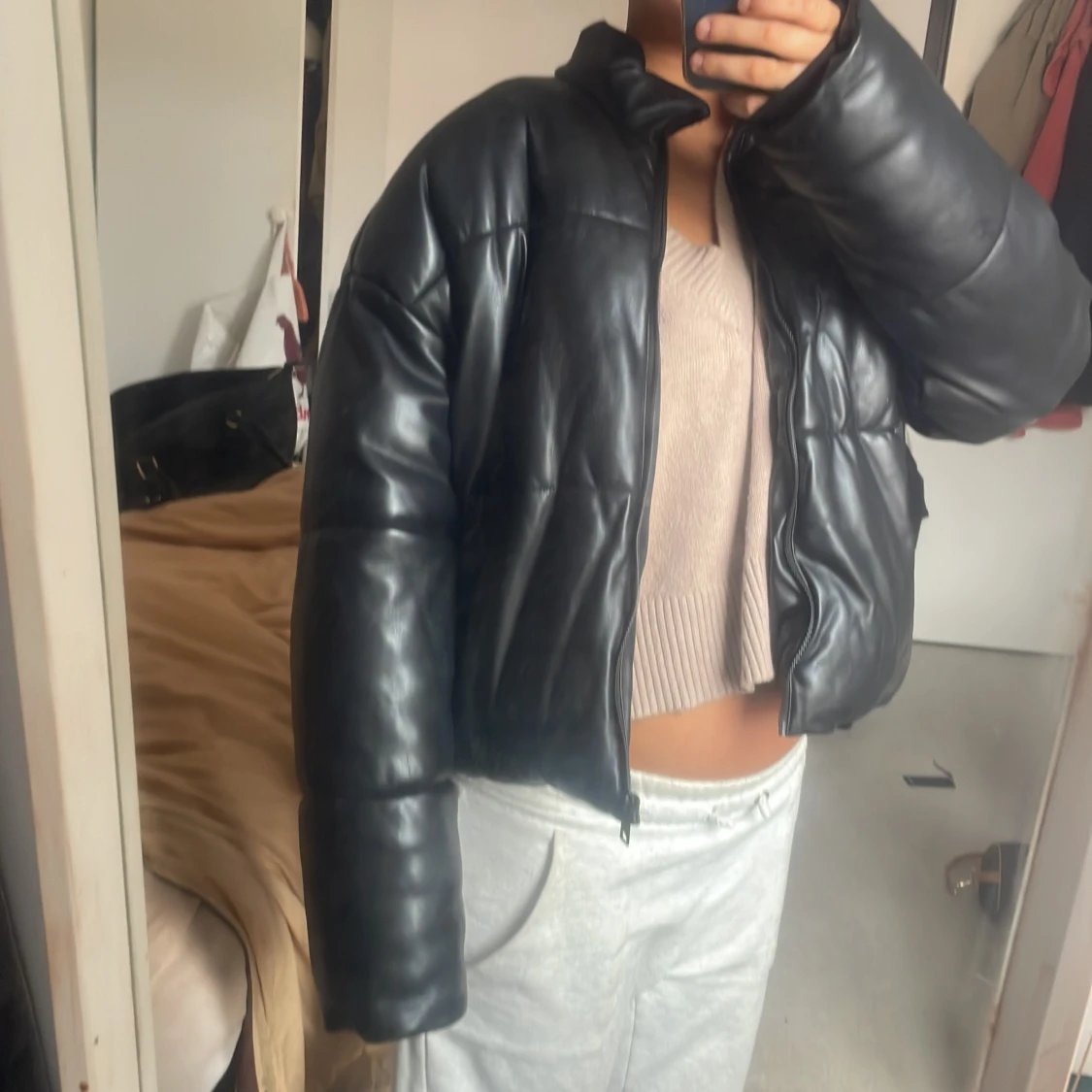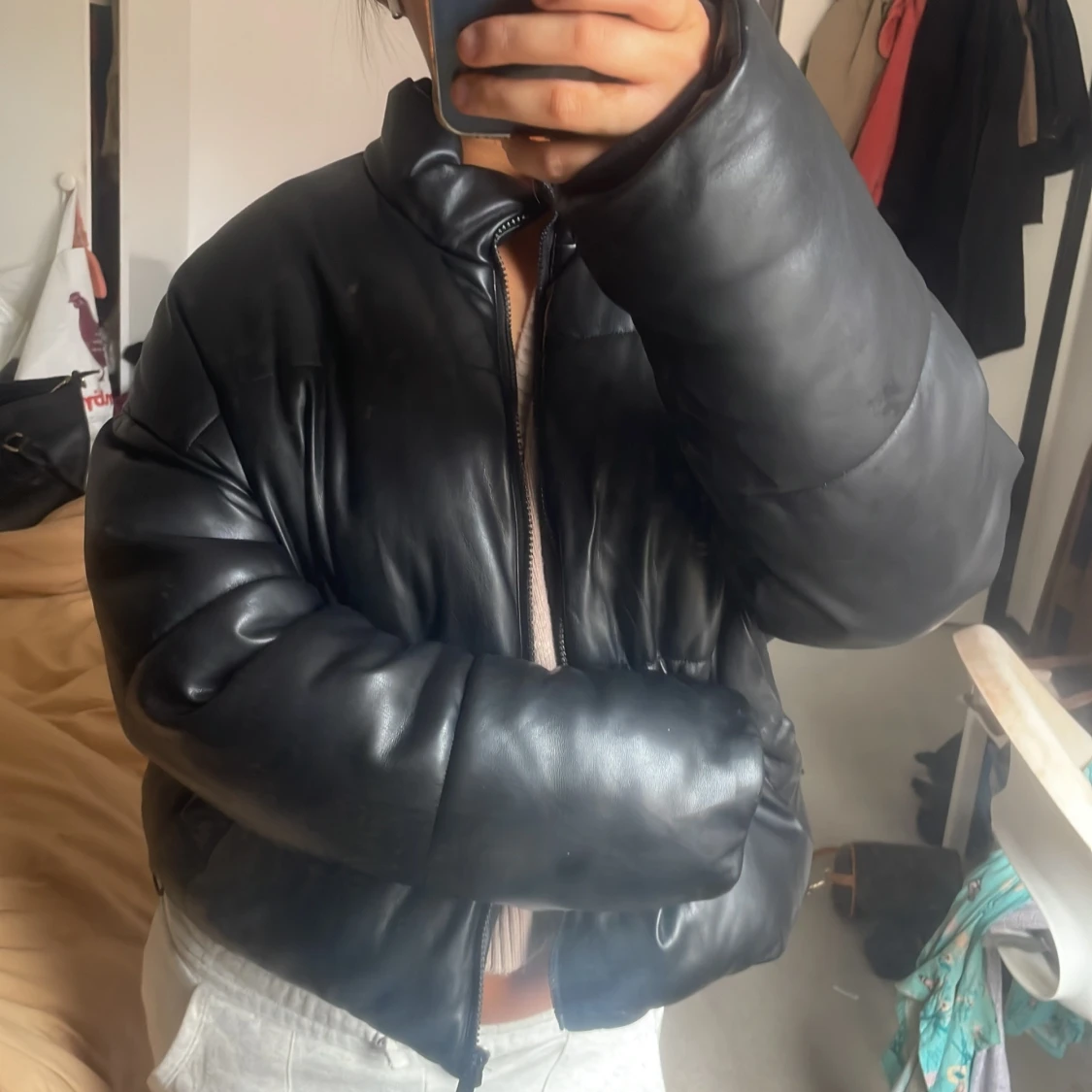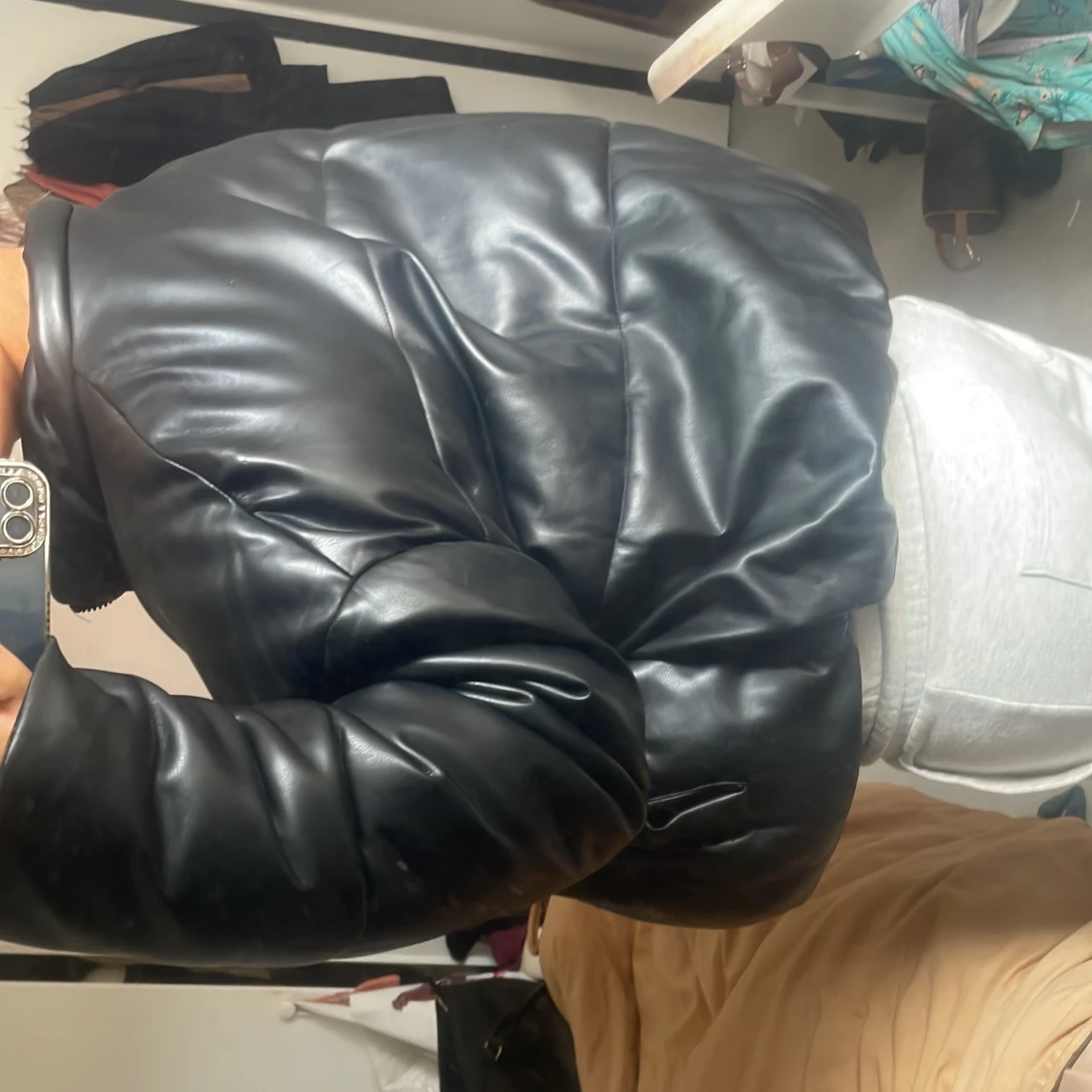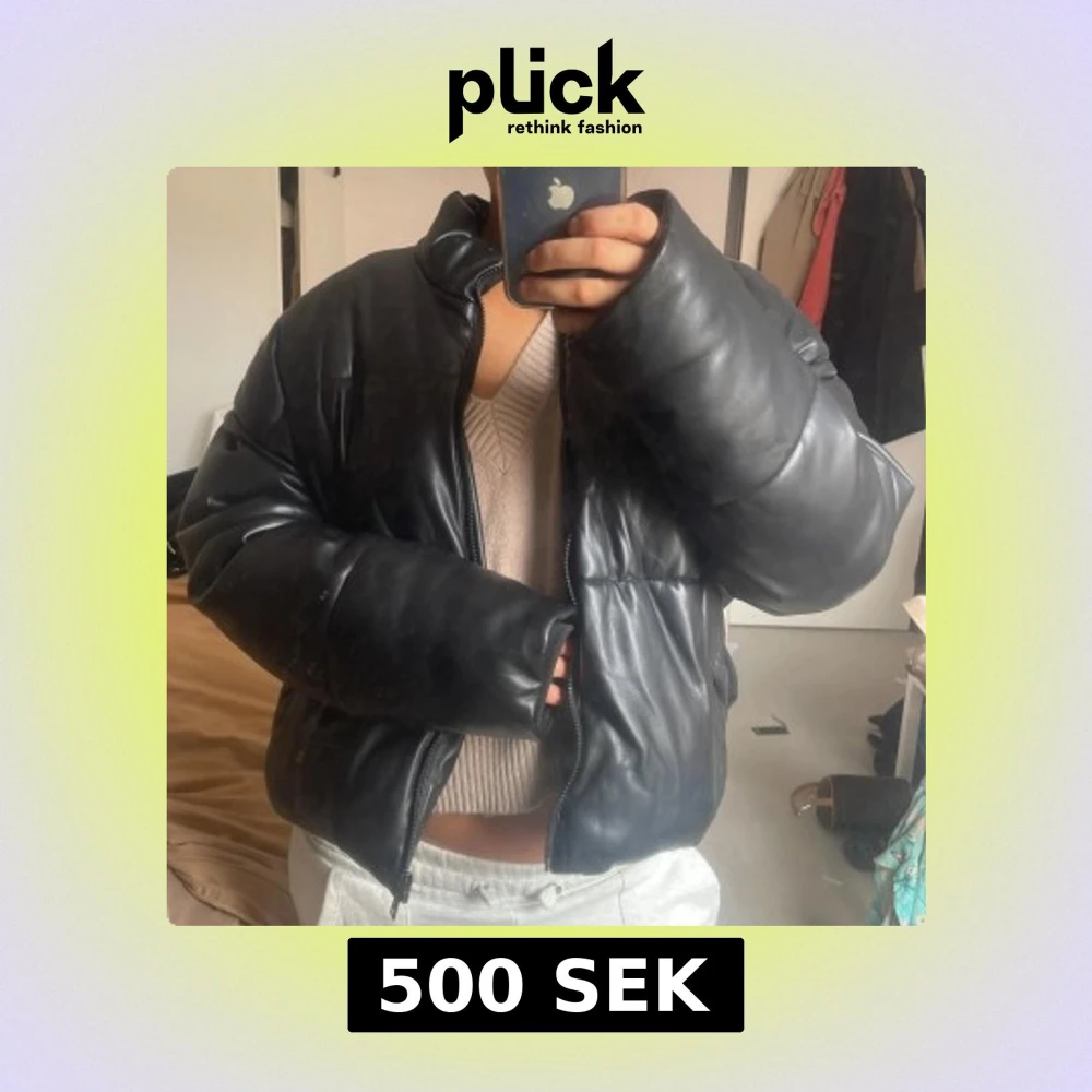 Säljer en svart pufferjacka med skinn-look och oversized passform. Jackan har quiltad design, dragkedja framtill och höga kragen. Perfekt för dig som gillar chunky och trendiga ytterplagg med street vibe. Jätteskön och varm. Nypris låg på 900kr
