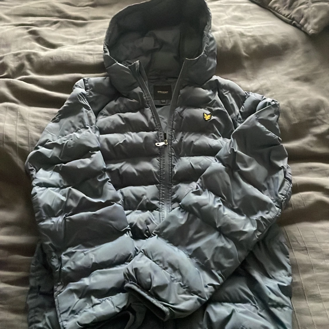 Säljer en pufferjacka från Lyle & Scott. Jackan har en dragkedja framtill och en huva för extra skydd mot väder. Perfekt för kyligare dagar. Passar xs, blå aktig, pris kan diskuteras