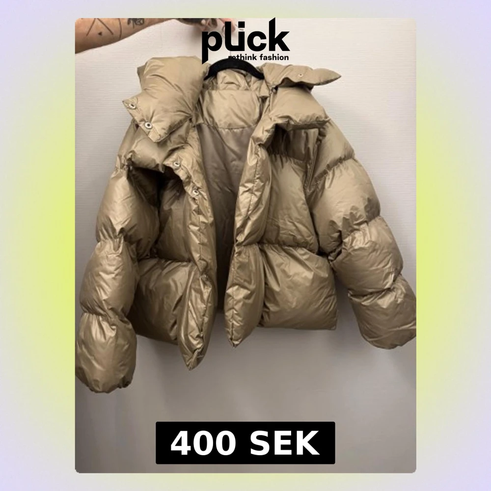 Säljer en pufferjacka med oversized passform och stor krage. Jackan har långa ärmar och är tillverkad i glansig syntet med quiltade partier. Perfekt för kalla dagar när du vill ha en riktigt snygg look.