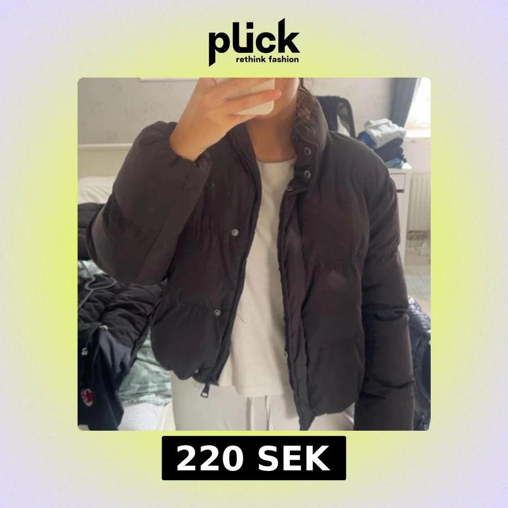 Säljer en svart pufferjacka med hög krage och dragkedja framtill. Jackan är quiltad och har två fickor med knappstängning. Perfekt för kalla dagar och har en oversized vibe. Passar dig som gillar en enkel men trendig look.