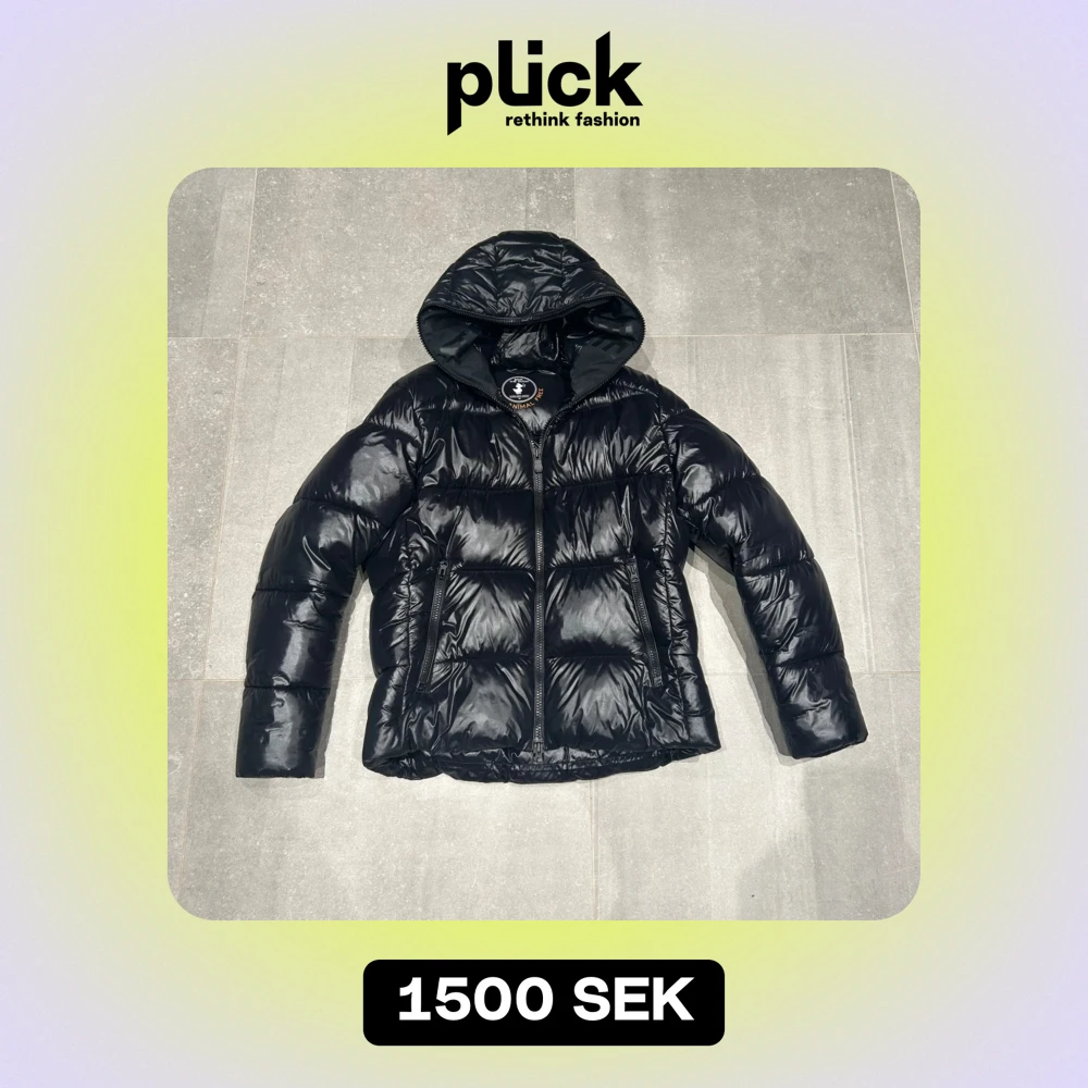 Säljer en svart pufferjacka från Save the Duck i storlek M. Jackan är 100% animal free och har en glansig finish med dragkedja och huva. Perfekt för kalla dagar när du vill hålla dig varm och stilren. 🖤