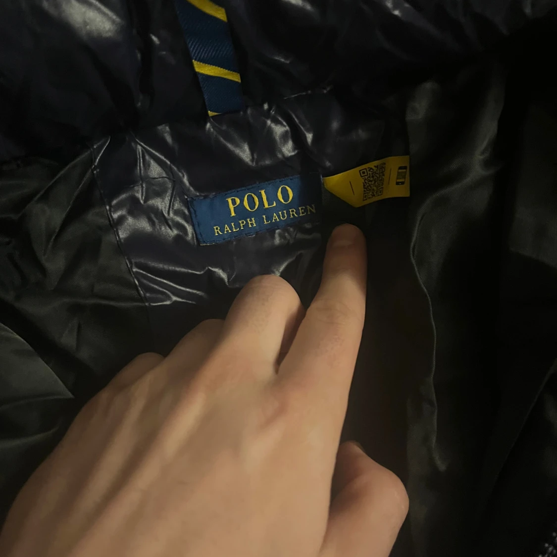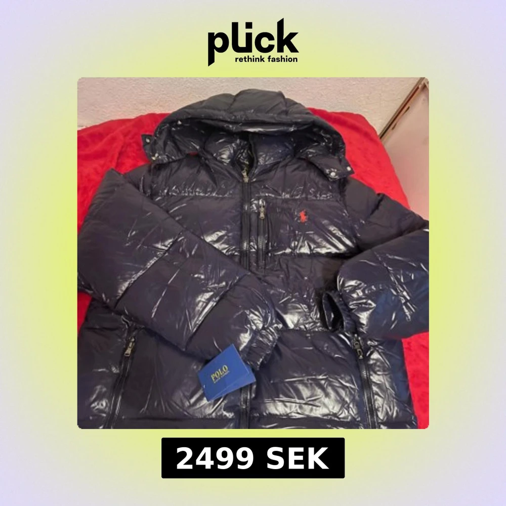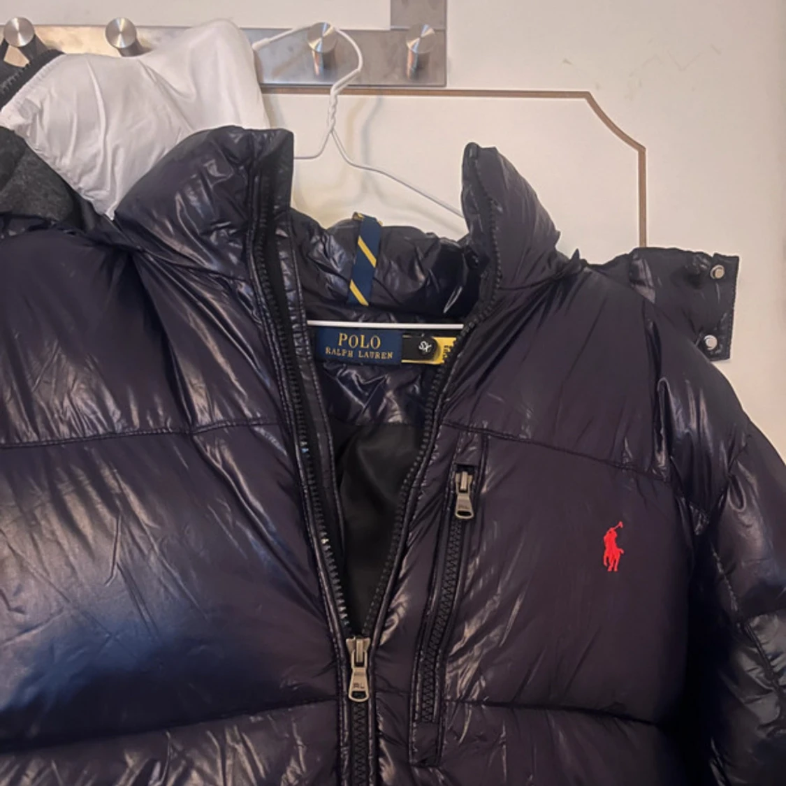 Säljer en marinblå glansig pufferjacka från Polo Ralph Lauren med röd logga på bröstet. Jackan har huva, flera dragkedjeförsedda fickor och quiltad design. Perfekt för kalla dagar och riktigt snygg till streetwear-stilen.