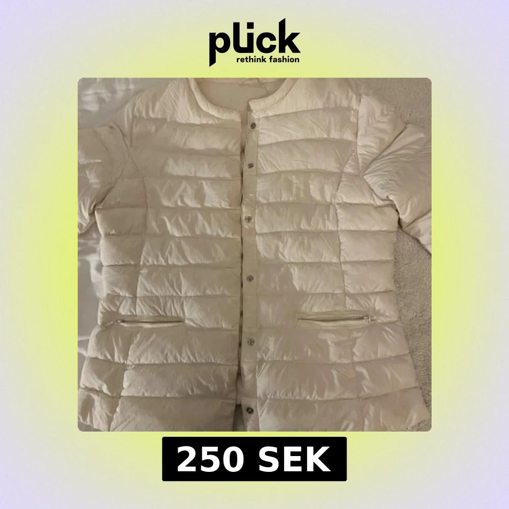 Snygg vit dunjacka med knappar. Tunnt material och lätt att matcha med olika outfits. Okänt märke och storlek men passar mig som vanligtvis har S