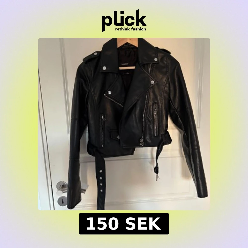 Säljer en svart skinnjacka från Pull&Bear. Jackan har dragkedjor, knappar, axelklaffar och bälte i midjan🌸