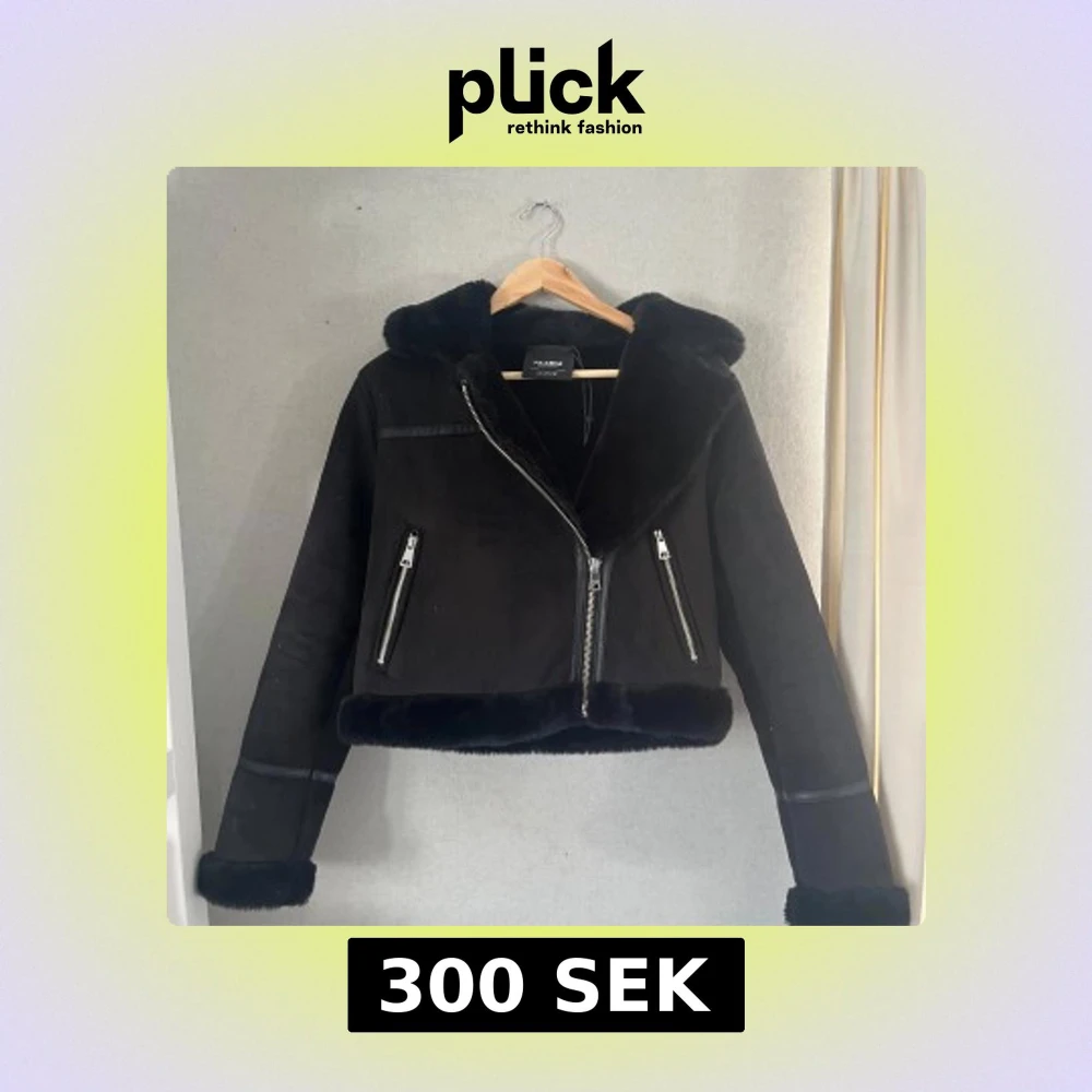 Säljer en svart jacka från Pull&Bear med fuskpälsdetaljer på krage, ärmslut och nederkant. Jackan har dragkedja framtill och två snedställda fickor med dragkedja. Perfekt för kyligare dagar.
