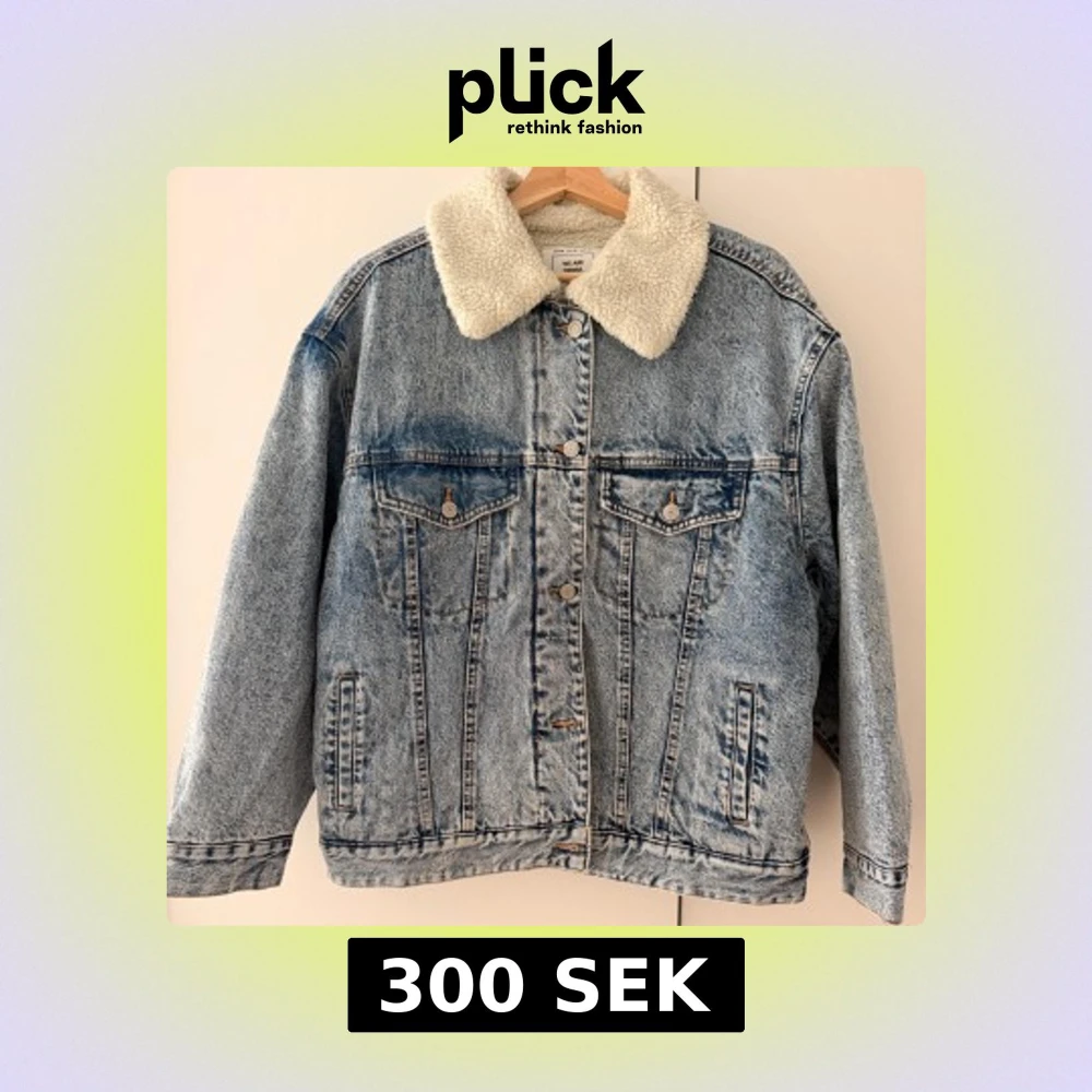 Snygg blå jeansjacka från Pull&Bear med vit teddykrage. Klassisk modell med knappar framtill, två bröstfickor och två sidofickor. Jackan har en oversized känsla och är perfekt för lager-på-lager-stil under höst och vinter.
