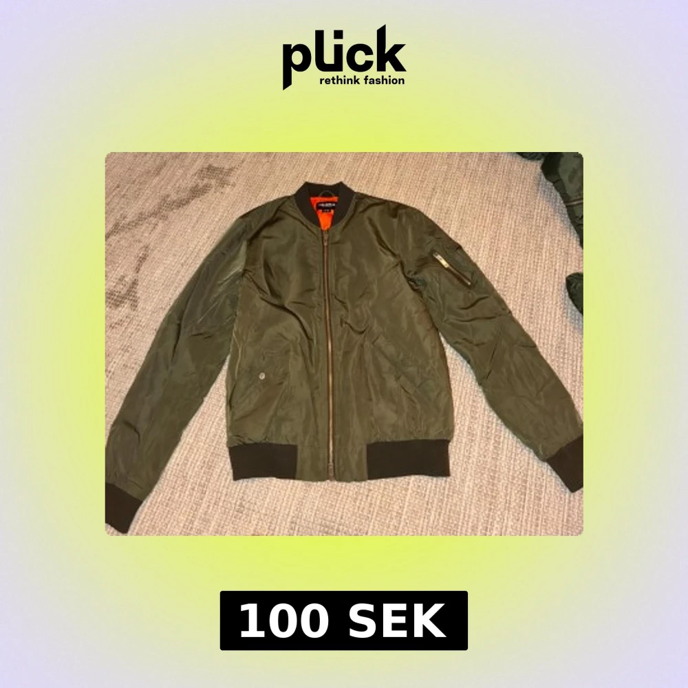Snygg olivgrön bomberjacka från Pull&Bear med orange foder. Jackan har dragkedja framtill, ribbade muddar och en ficka med dragkedja på ärmen. Perfekt för dig som gillar streetstyle och vill ha en klassisk look.