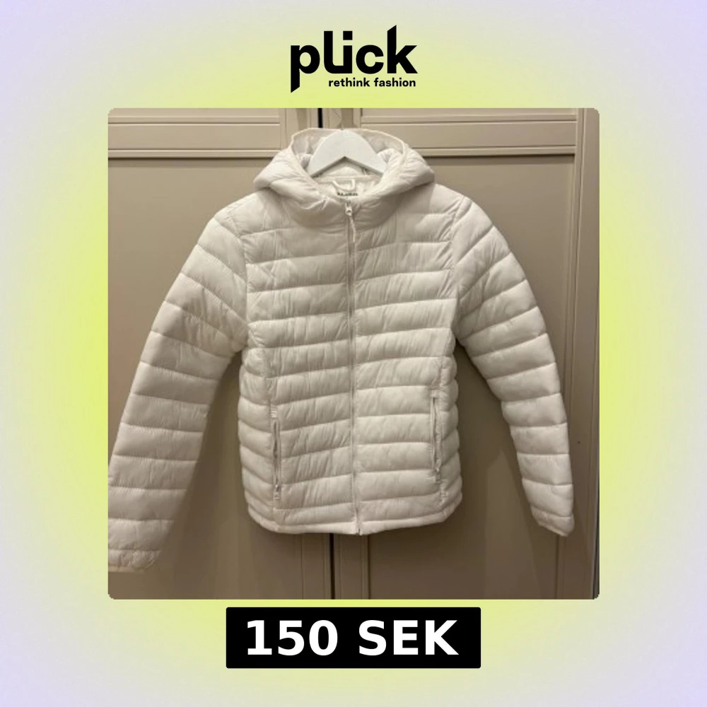 Säljer en fräsch vit pufferjacka från Pull&Bear i storlek S. Jackan har huva, två sidofickor med dragkedja och quiltad design.