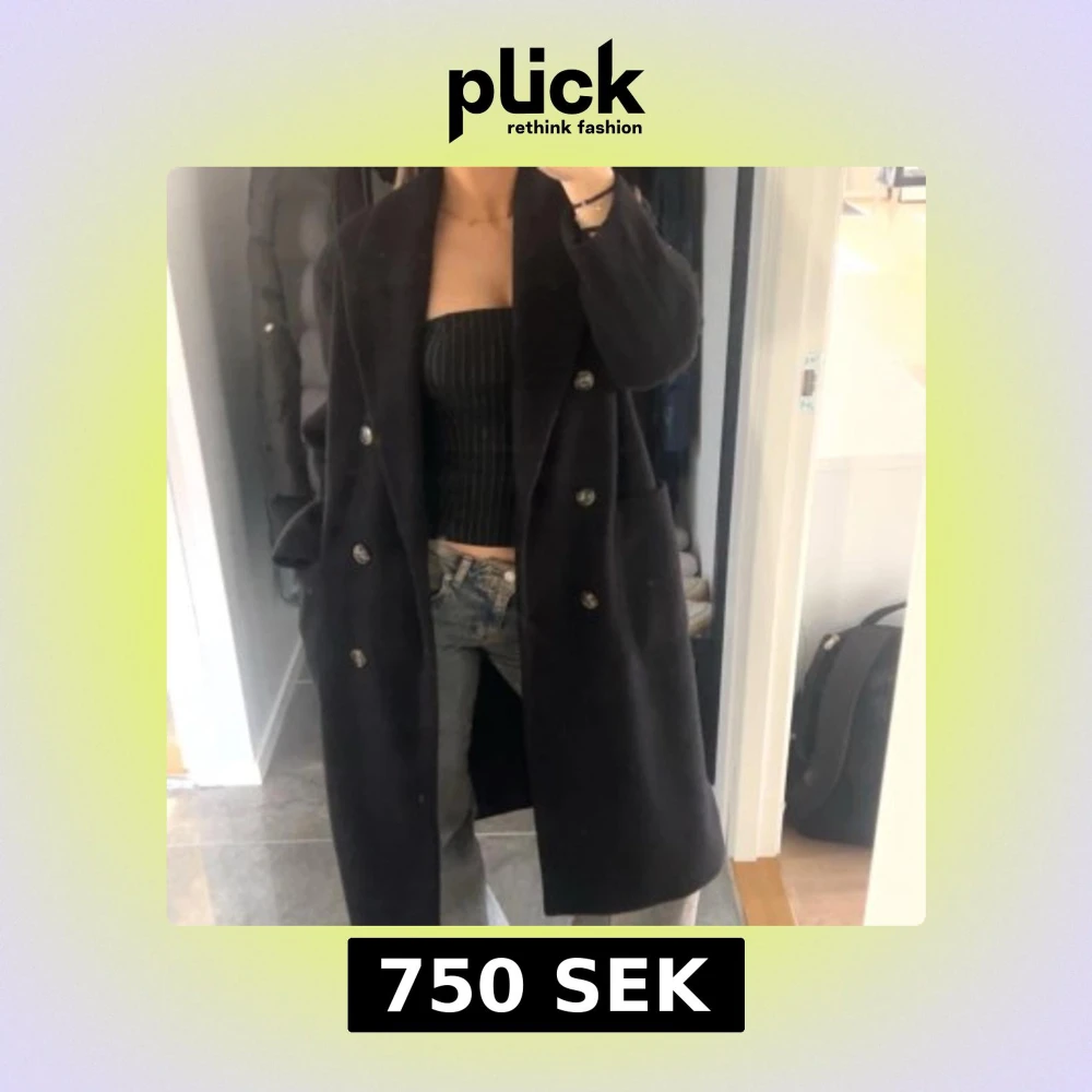 Säljer en svart lång kappa med dubbelknäppning och bred krage. Jackan har stora fickor på sidorna och en stilren, rak passform som ger en chill vibe. Perfekt för dig som gillar minimalistisk stil och vill ha något som funkar hela hösten och vintern.