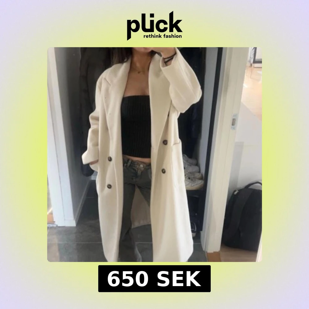 Säljer en stilren och lång vit kappa med bred krage och stora svarta knappar framtill. Jackan har en rak passform och två praktiska fickor på sidorna. Perfekt för dig som gillar minimalistisk och clean stil.