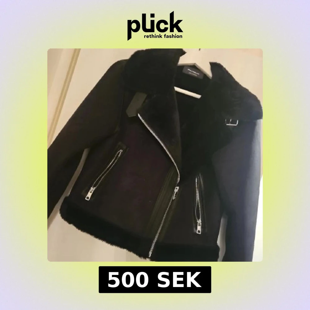 Säljer en svart pälsjacka från Pull&Bear med fluffig krage och muddar. Jackan har två sneda dragkedjefickor, snygga detaljer med spänne vid kragen och en croppad passform. Perfekt för dig som vill ha en cool och varm look i vinter.
