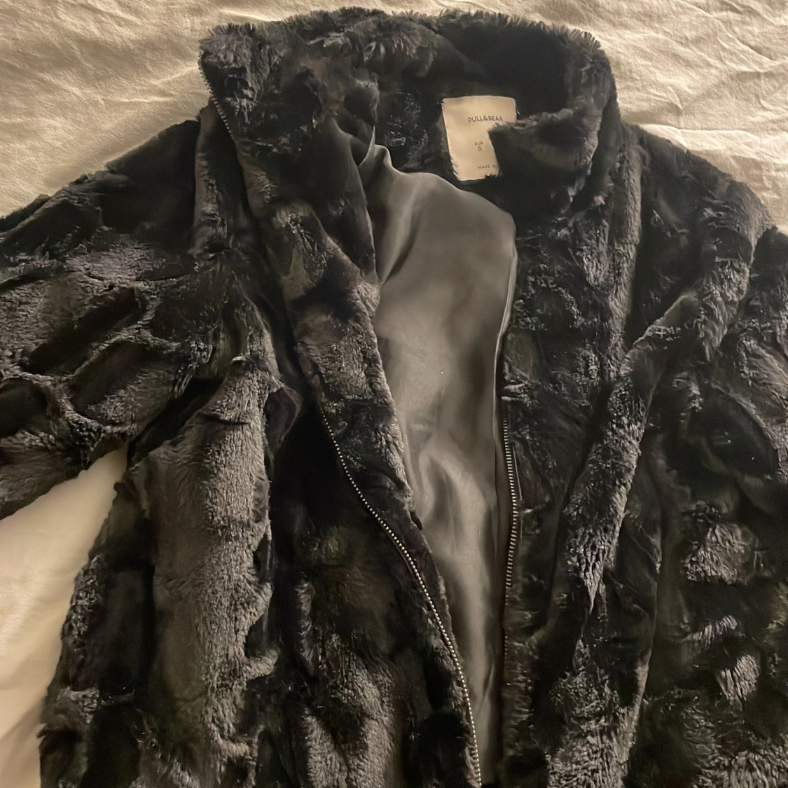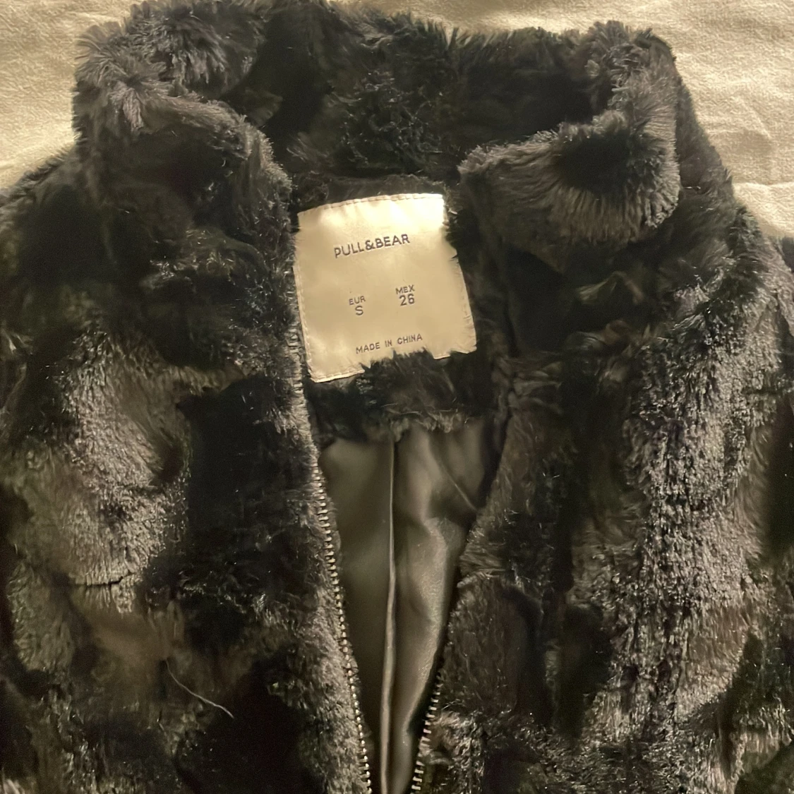 Säljer en svart pälsjacka från Pull&Bear i storlek S. Jackan har en fluffig och mjuk yta med snyggt mönstrad päls, hög krage och dragkedja framtill. Perfekt för dig som vill ha en cool och varm look under kyliga dagar.