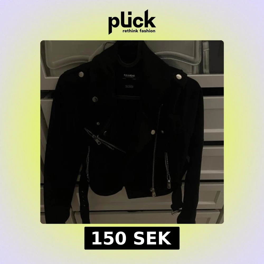 Snygg svart skinnjacka från Pull&Bear i storlek XS. Jackan har klassisk bikerstil med silvriga dragkedjor, knappar och bälte i midjan. Perfekt för dig som vill ha en edgy look med coola detaljer och croppad passform.