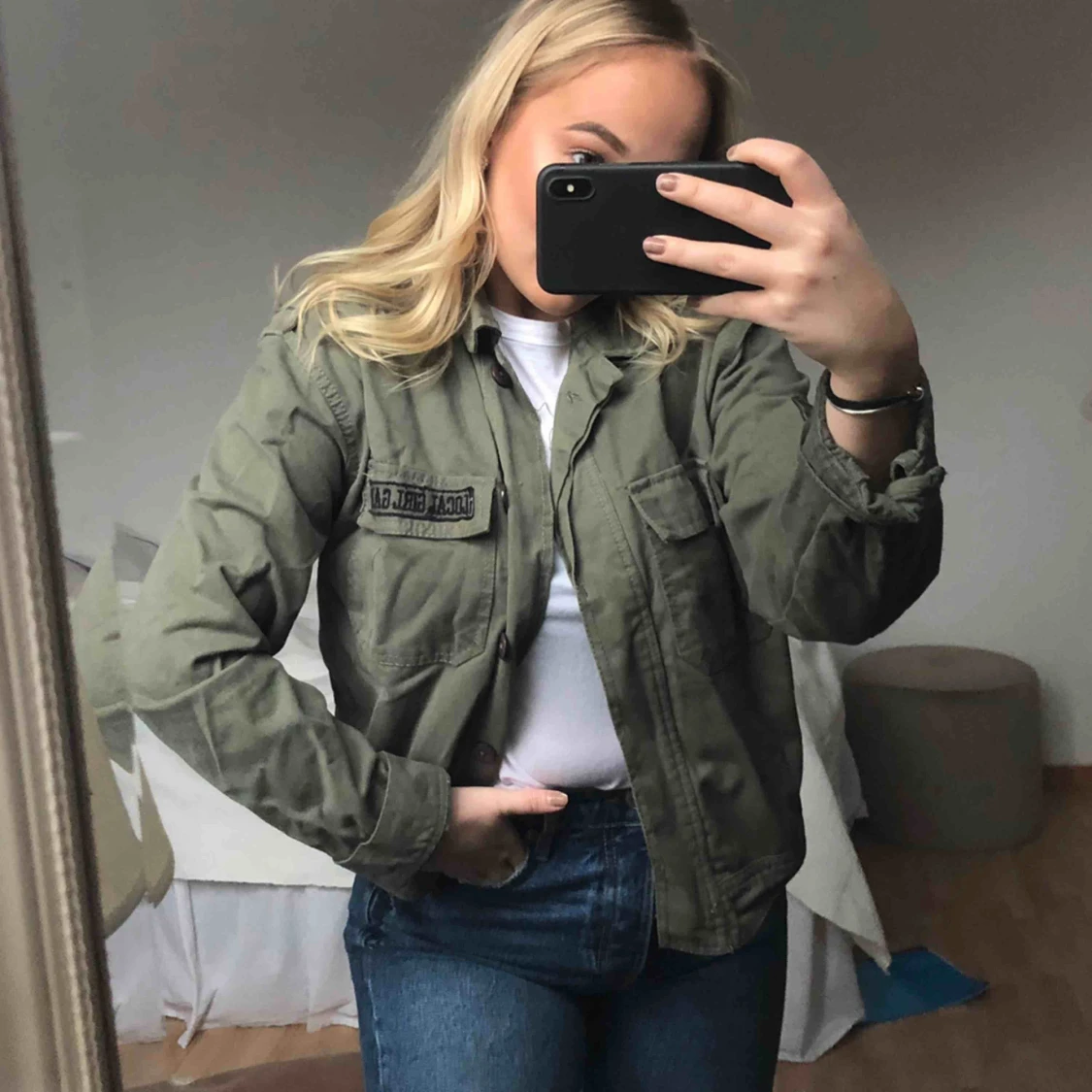 Militärgrön jacka o fint skick, använd fåtal gånger! Står ”local girl gang” på ena fickan