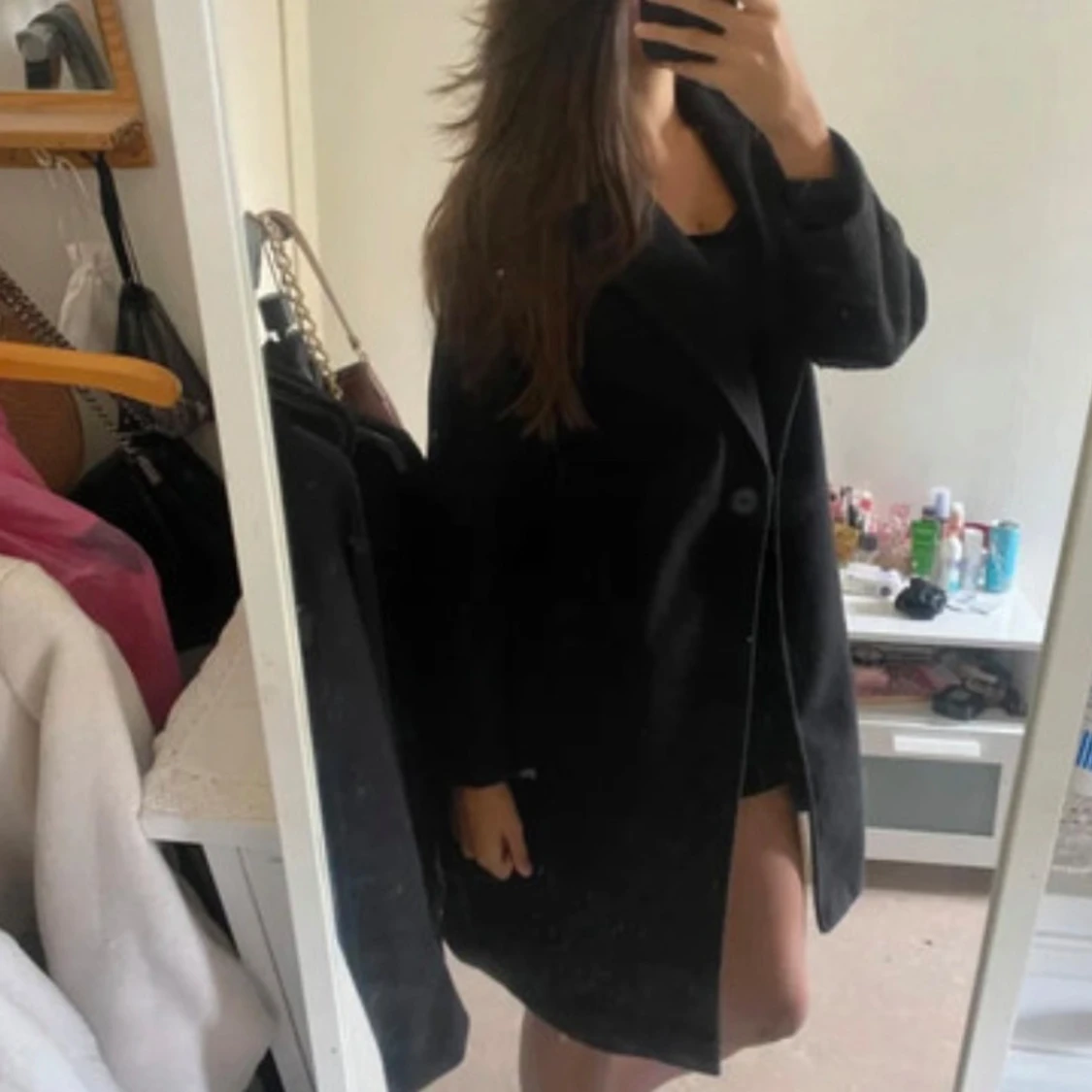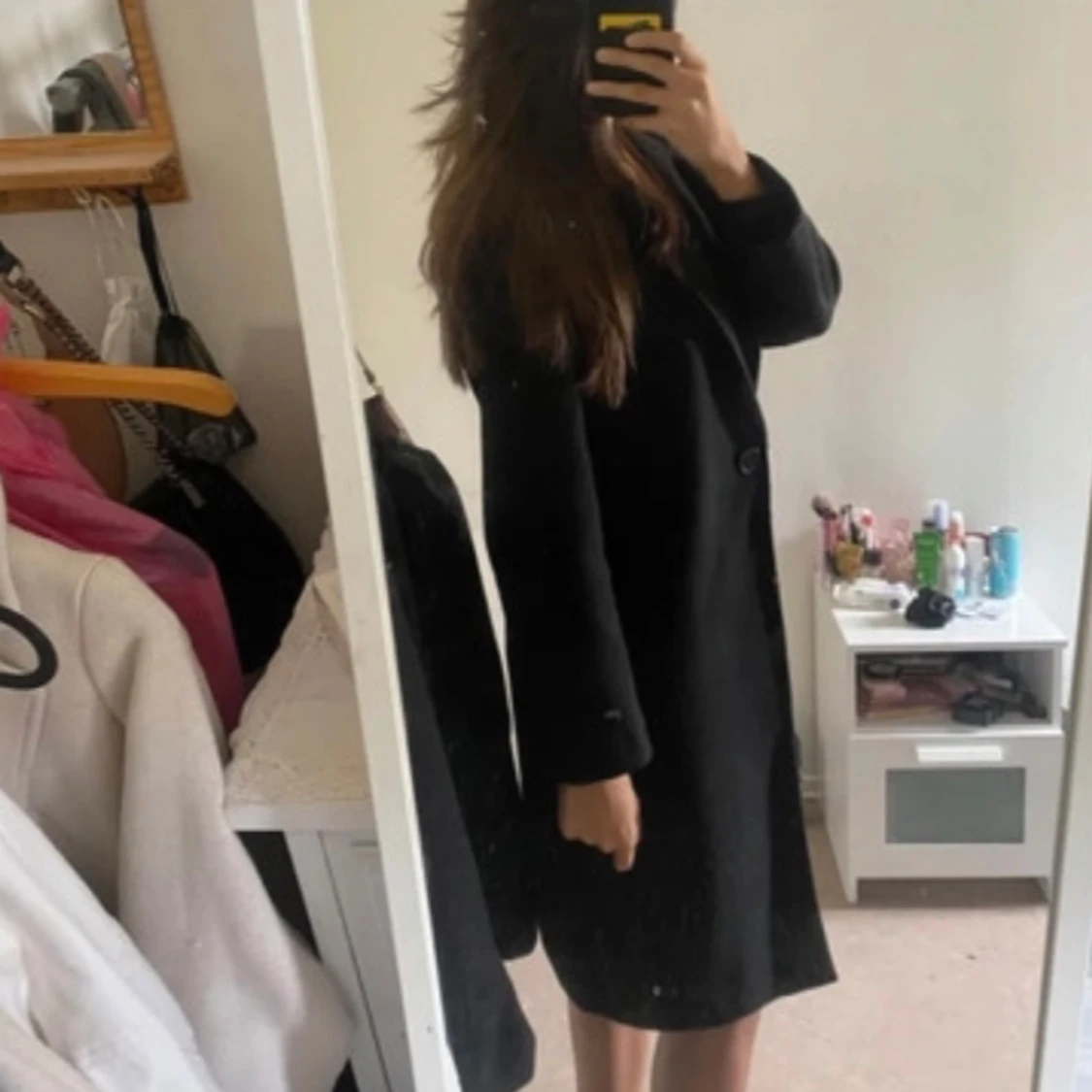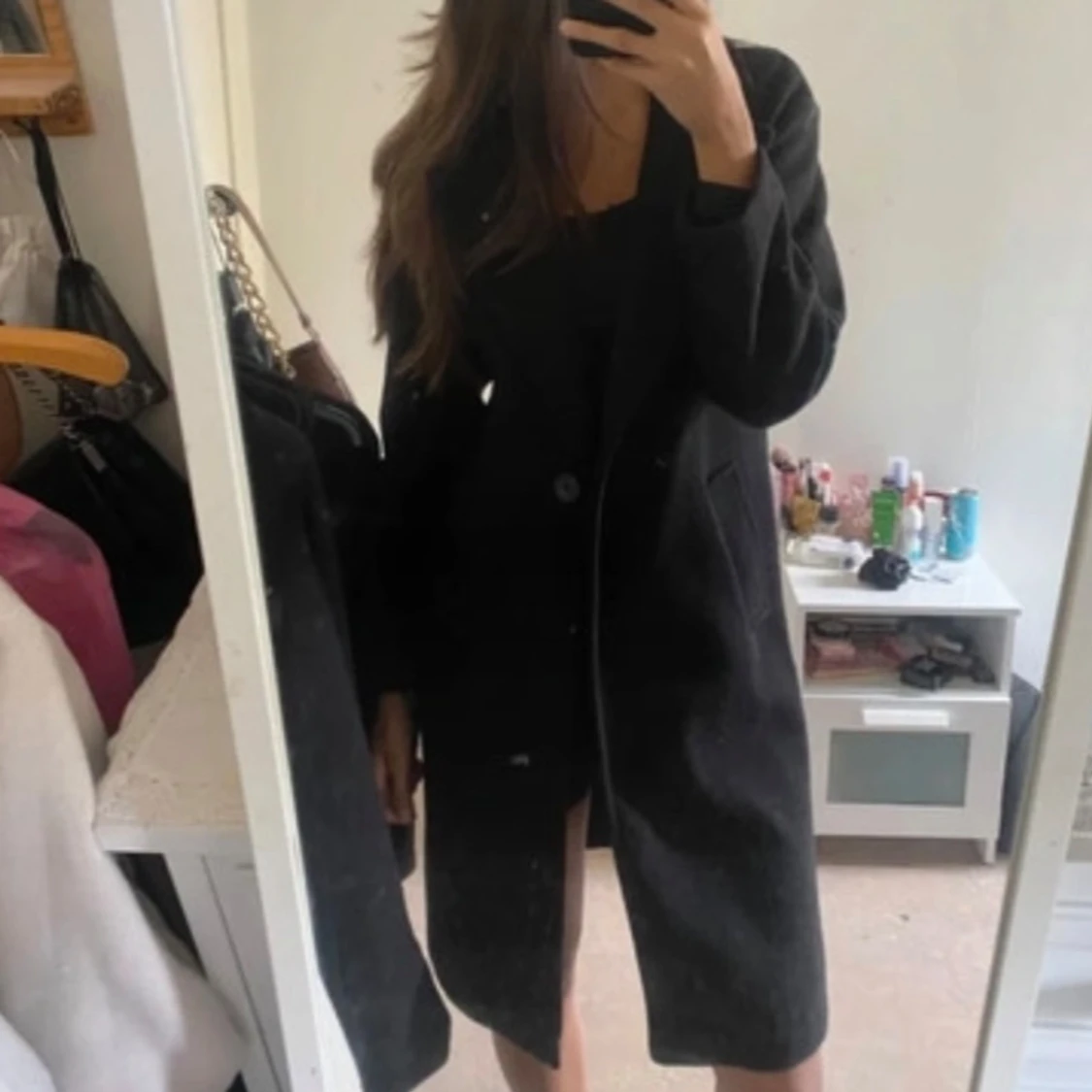 Säljer en stilren svart kappa i bra skick. Den har en klassisk design med långa ärmar och knappar framtill. Perfekt för höst och vår, och funkar både till vardags och fest. Passar bra till en chic och elegant stil. 🖤