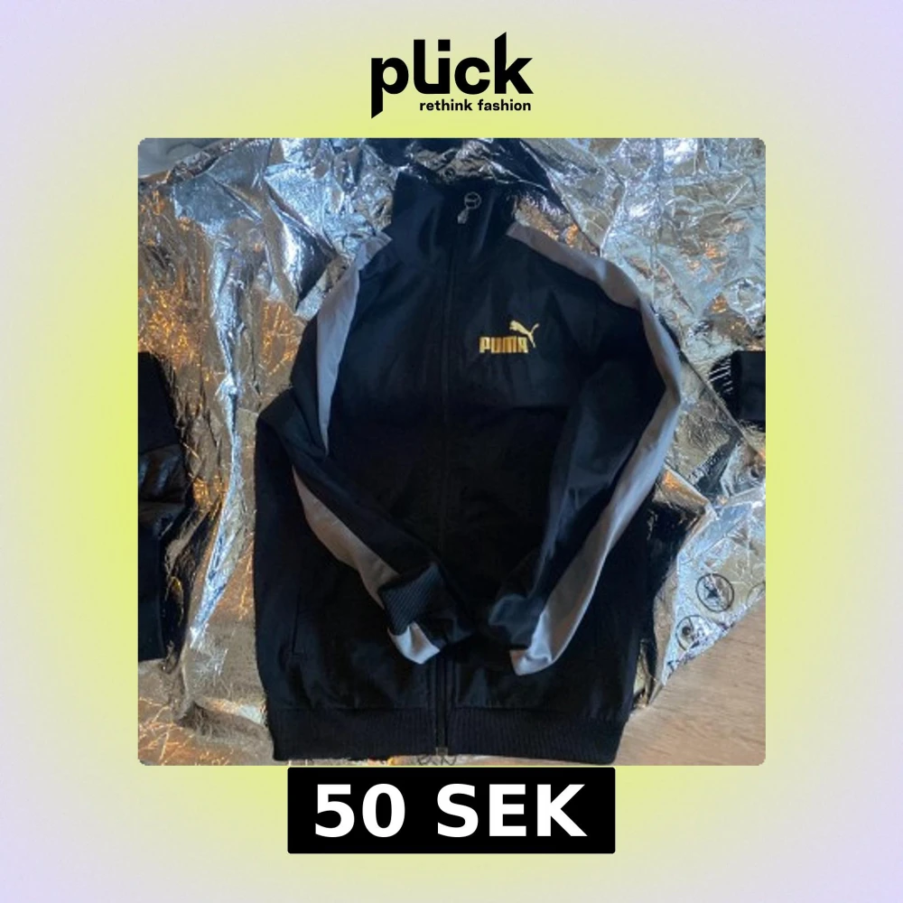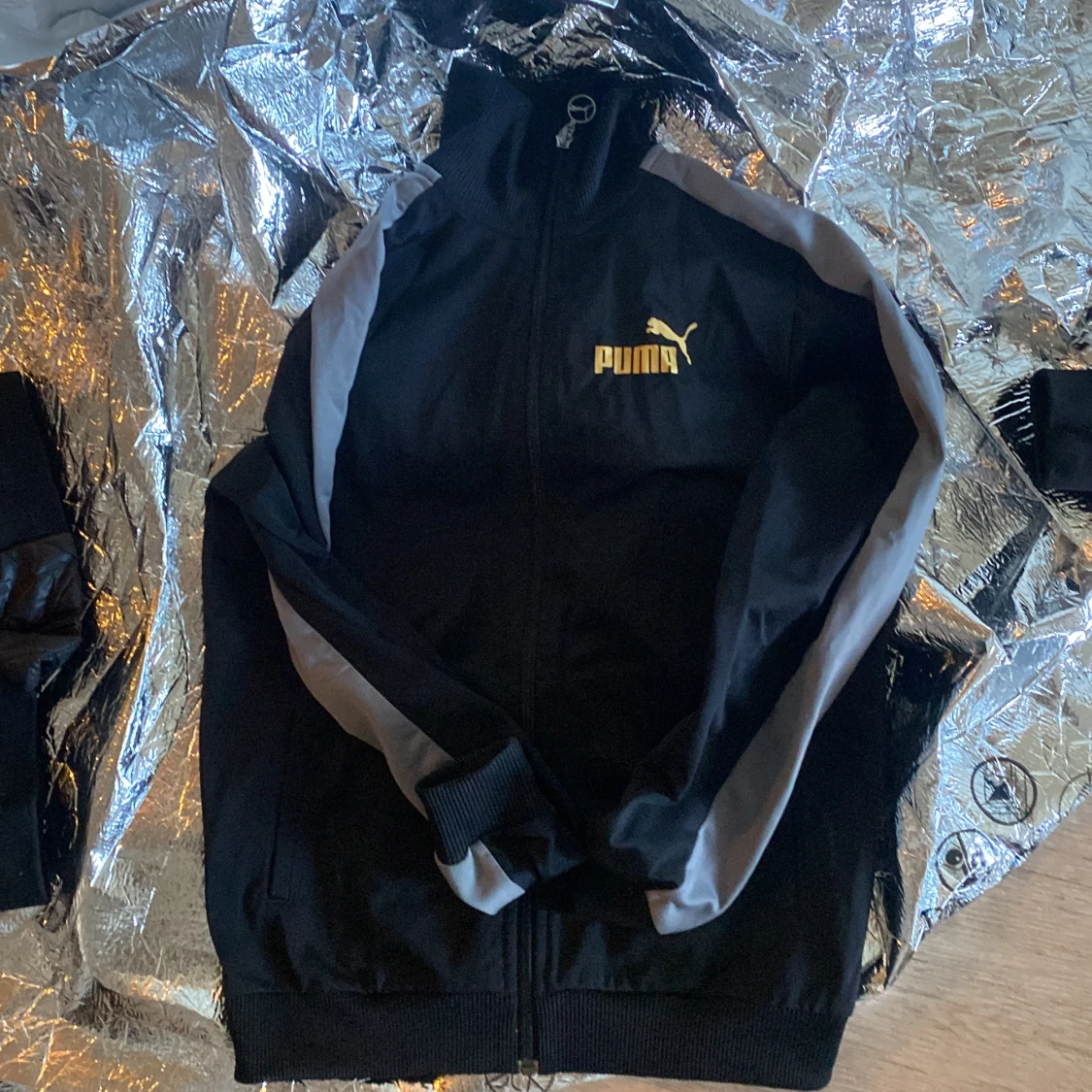 Svart träningsjacka från Puma med dragkedja och gul logga på bröstet. Jackan har långa ärmar med gråa och vita ränder längs sidorna. Perfekt för sportiga tillfällen.