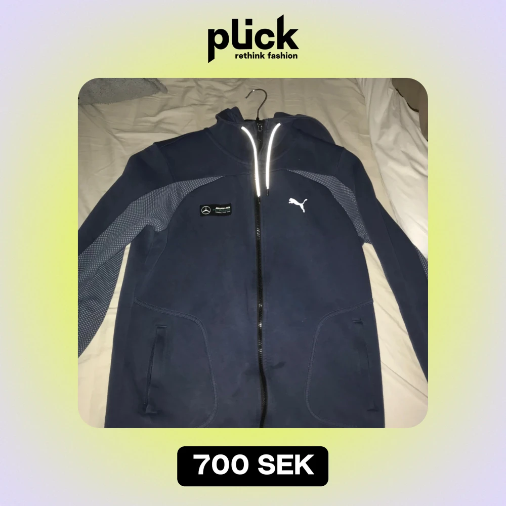 Säljer en snygg mörkblå jacka från Puma i samarbete med Mercedes. Jackan har en dragkedja framtill och är långärmad med ett coolt mönster på ärmarna. Perfekt för höst och vår! 🏎️