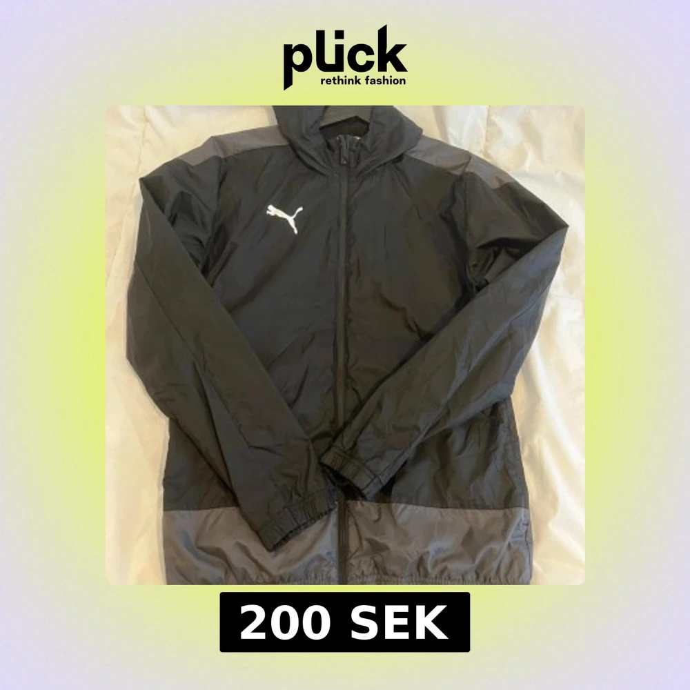 Snygg svart vindjacka från Puma med gråa detaljer och vit logga på bröstet. Jackan har huva, hel dragkedja och elastiska muddar vid ärmsluten. Perfekt för blåsiga dagar och enkel att slänga på sig över en hoodie.