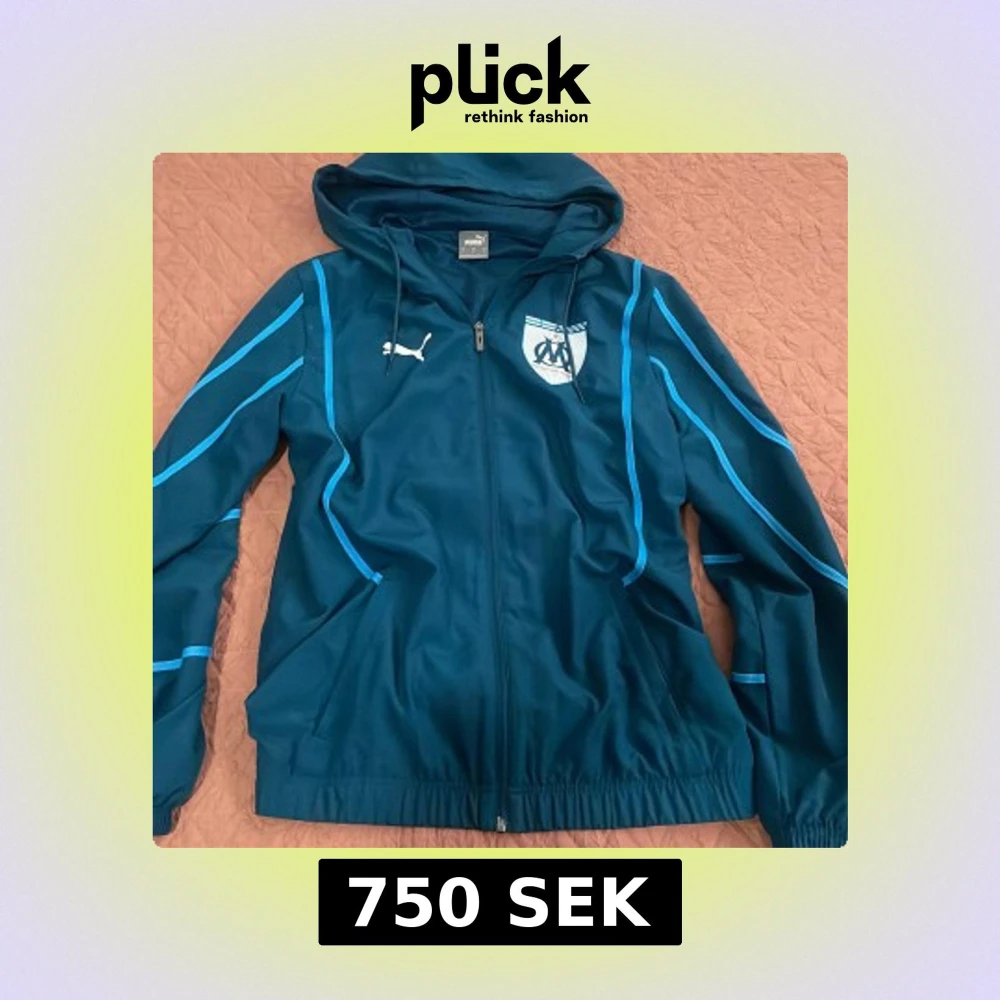 Snygg marinblå vindjacka från Puma med Olympique Marseille-logga på bröstet. Jackan har huva med snörning, dragkedja framtill och ljusblå detaljer längs ärmarna. Perfekt för dig som gillar sportig stil och vill representera ditt lag.