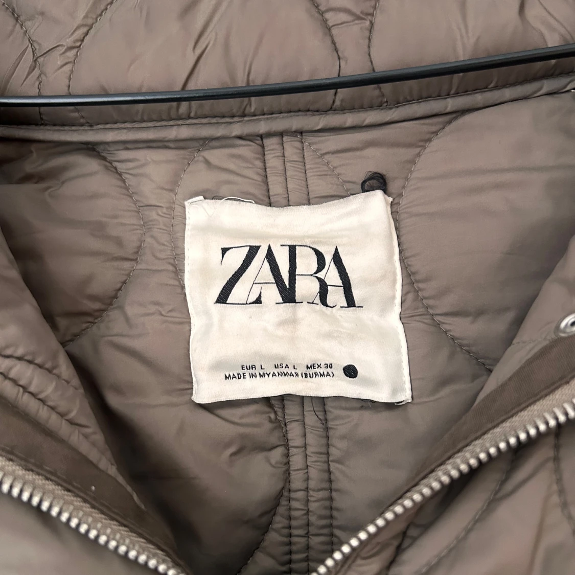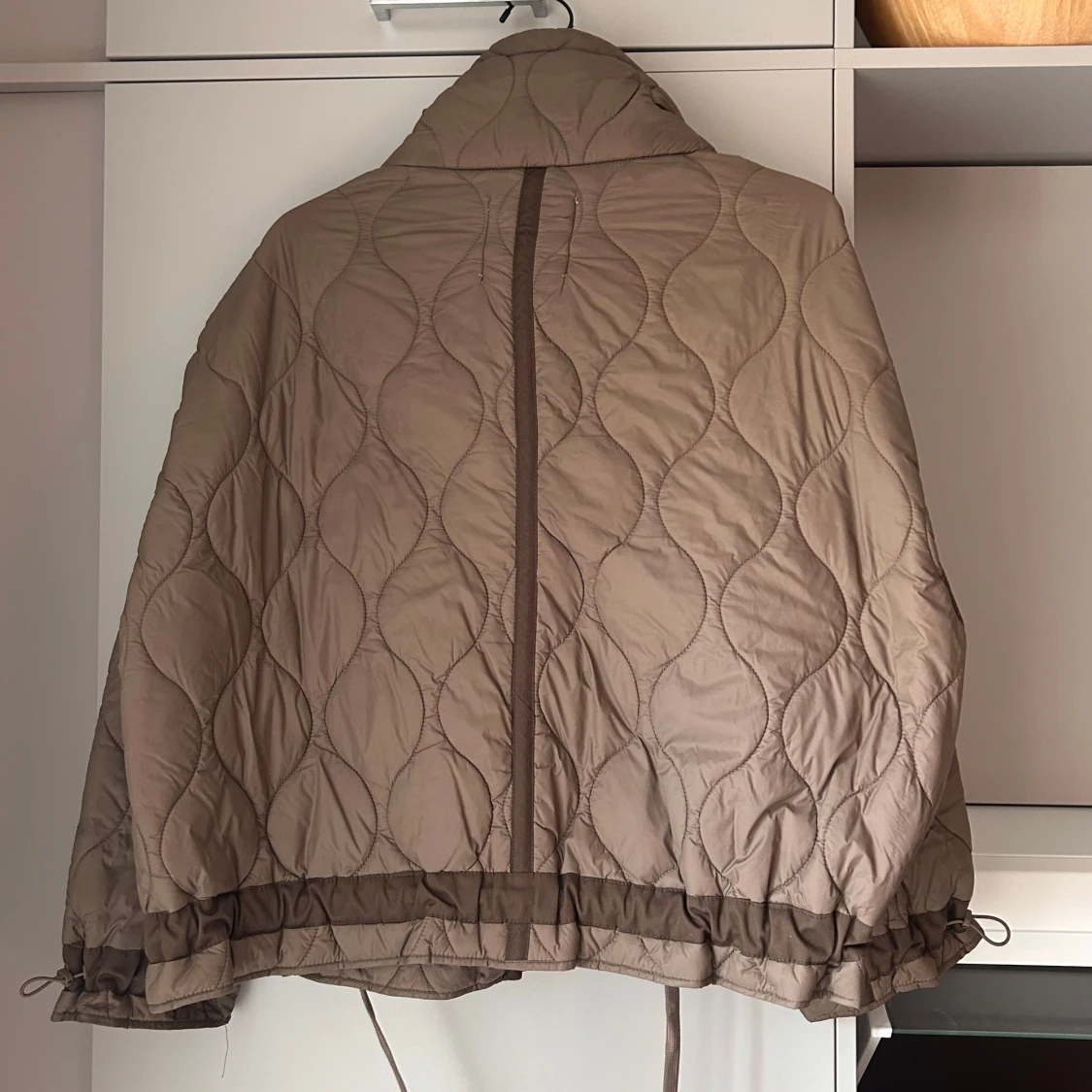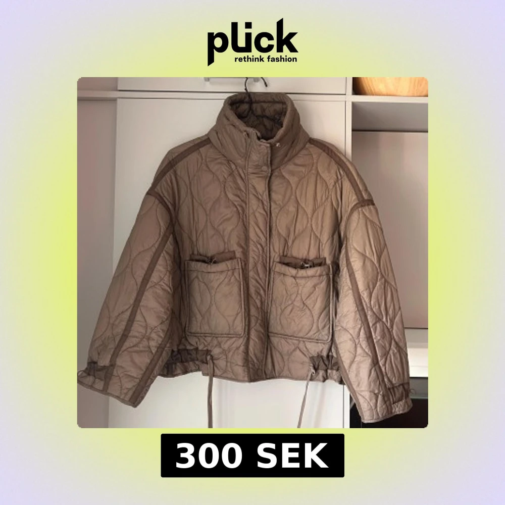Quiltad beige jacka från Zara med hög krage, två stora fickor framtill och dragsko i midjan samt ärmarna. Passar både till vardags och på kvällen. Den är large men skulle säga att den passar s/m också eftersom man kan dra åt den i midjan och ärmarna för annan passform.