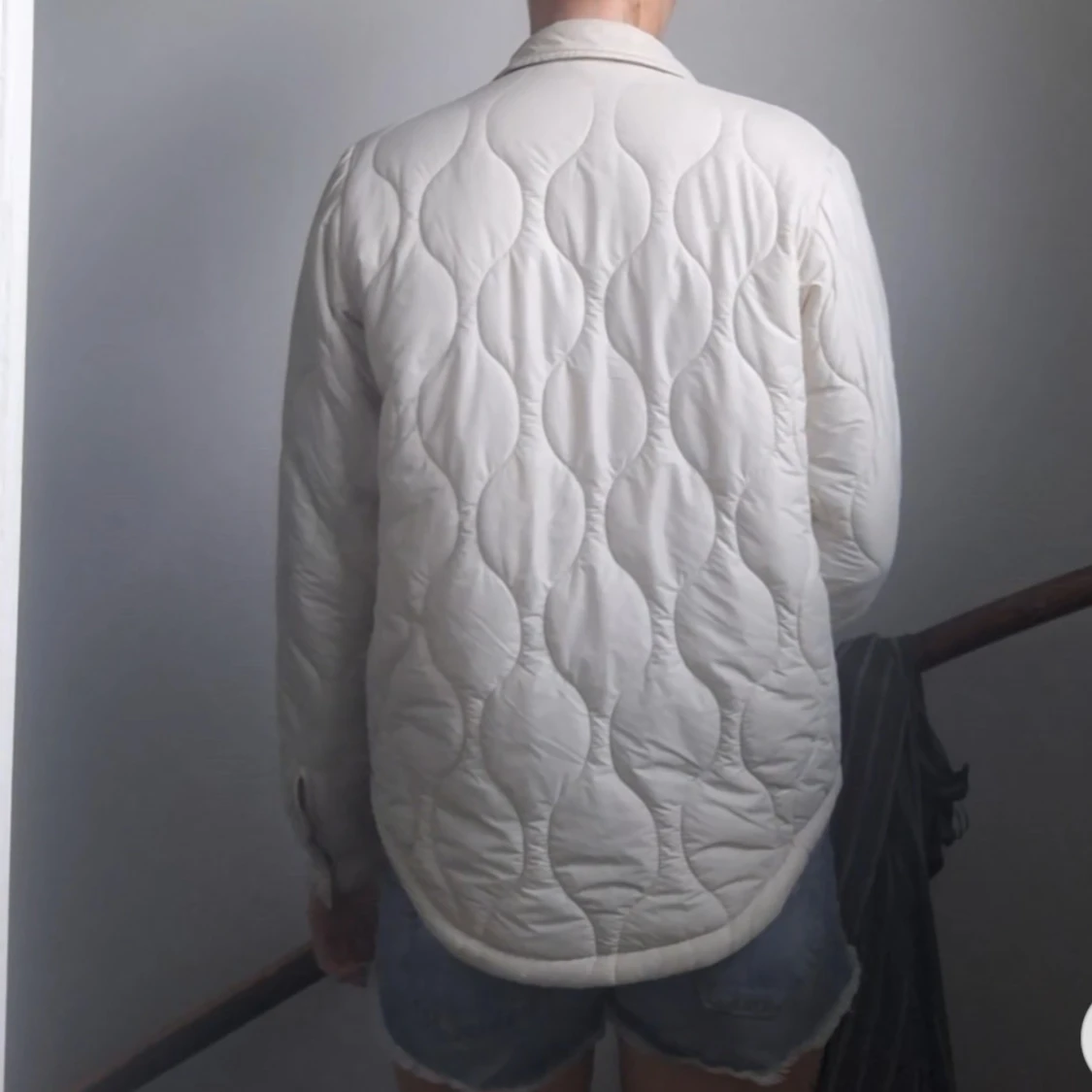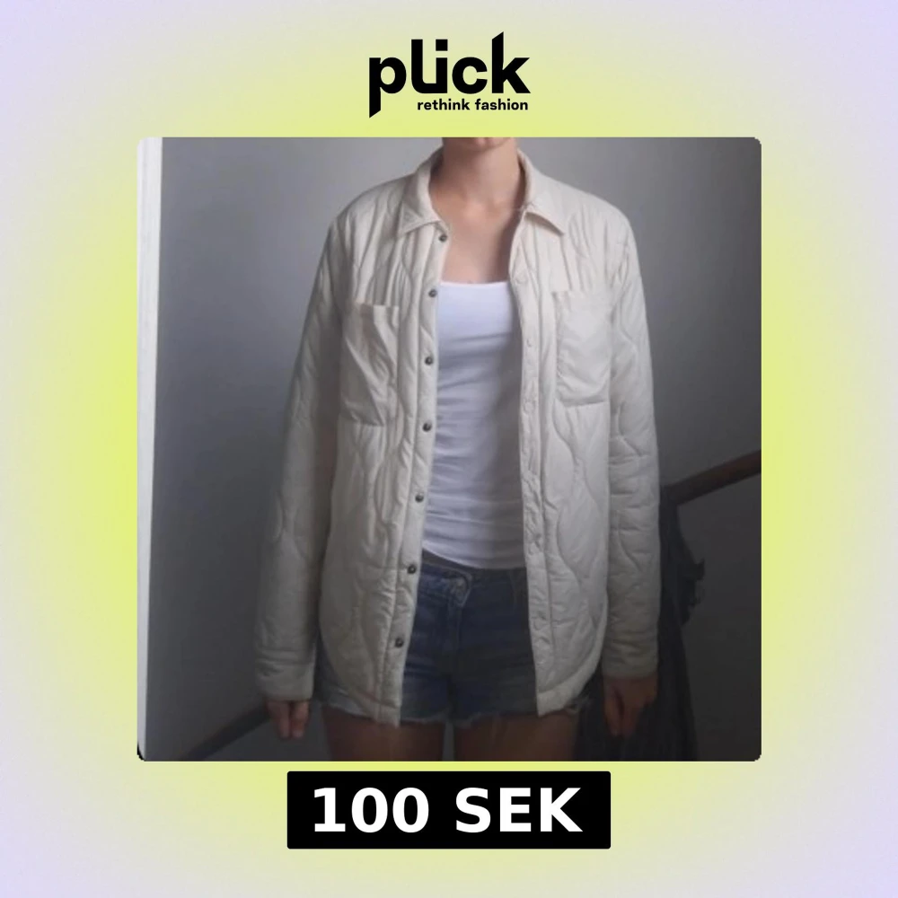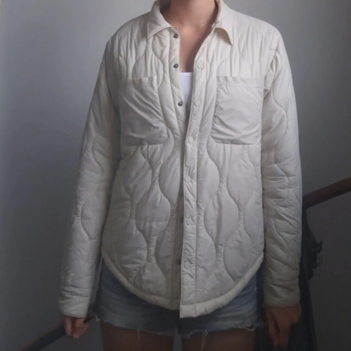 Quiltad overshirt i beige med snygga tryckknappar framtill och två bröstfickor. Jackan har långärmad passform och rundad nederkant. Inte använd så ofta och det står att den är i storlek 170 men passar mig som har S