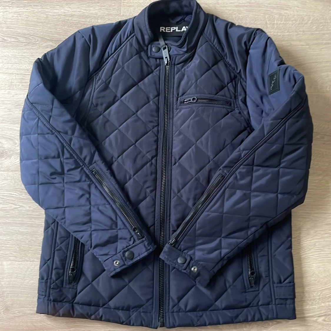 Snygg quiltad jacka från Replay i mörkblått med dragkedjor på ärmar och fickor. Jackan har ett rutigt mönster, hög krage med knapp och en bröstficka med dragkedja. Perfekt för dig som gillar stilren och sportig look.(PRIS KAN DIKSUTERAS) storlek m