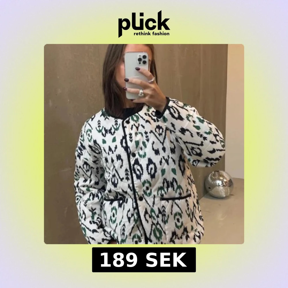 Säljer en quiltad jacka med svartvitt mönster och gröna detaljer. Jackan har svarta kanter, knappar framtill och fickor med svarta detaljer. Den har en loose passform och lång ärm, perfekt för dig som gillar statement-plagg.