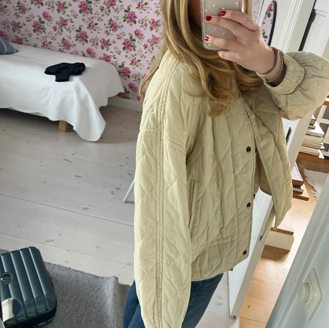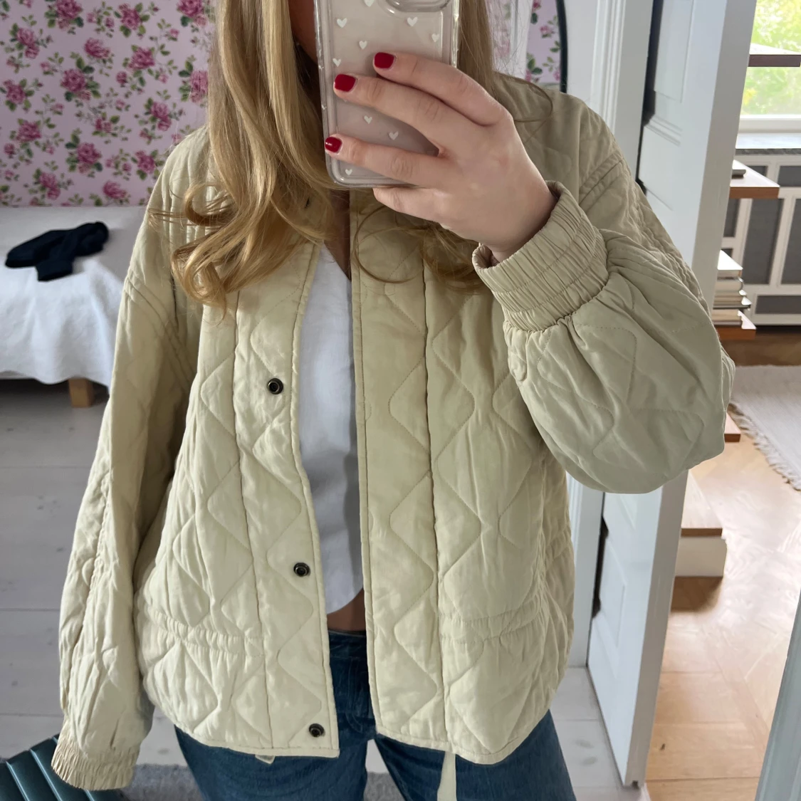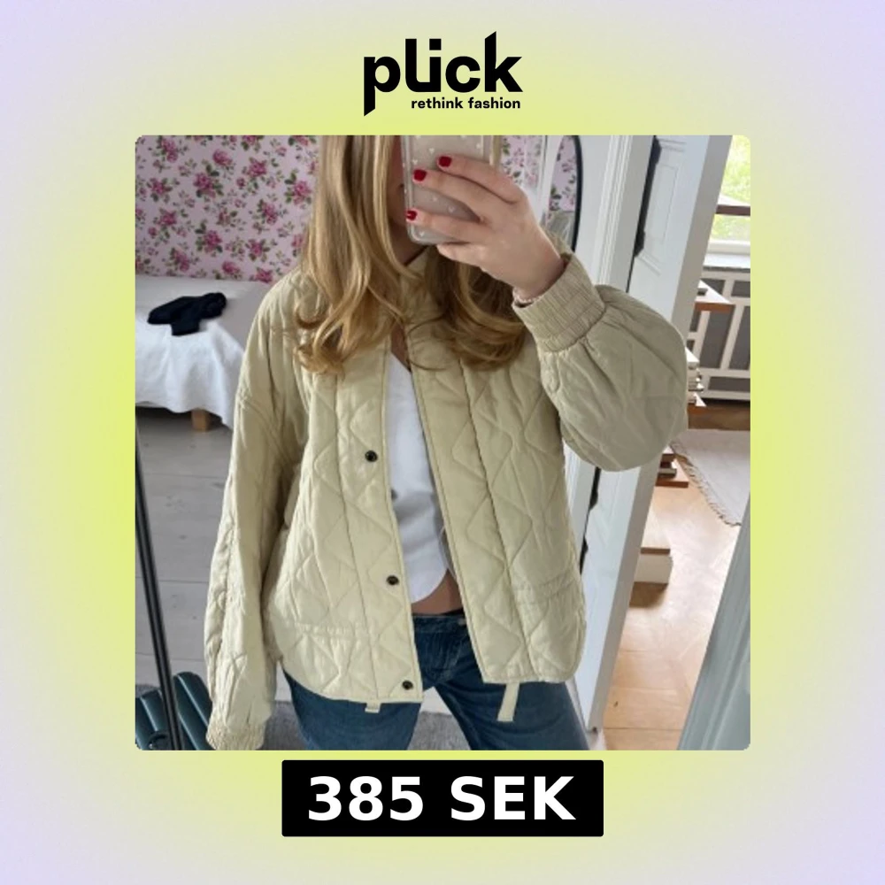 Säljer en beige quiltad jacka med oversized passform och långa ärmar. Så fin och använd endast ett fåtal gånger💛☀️🤍