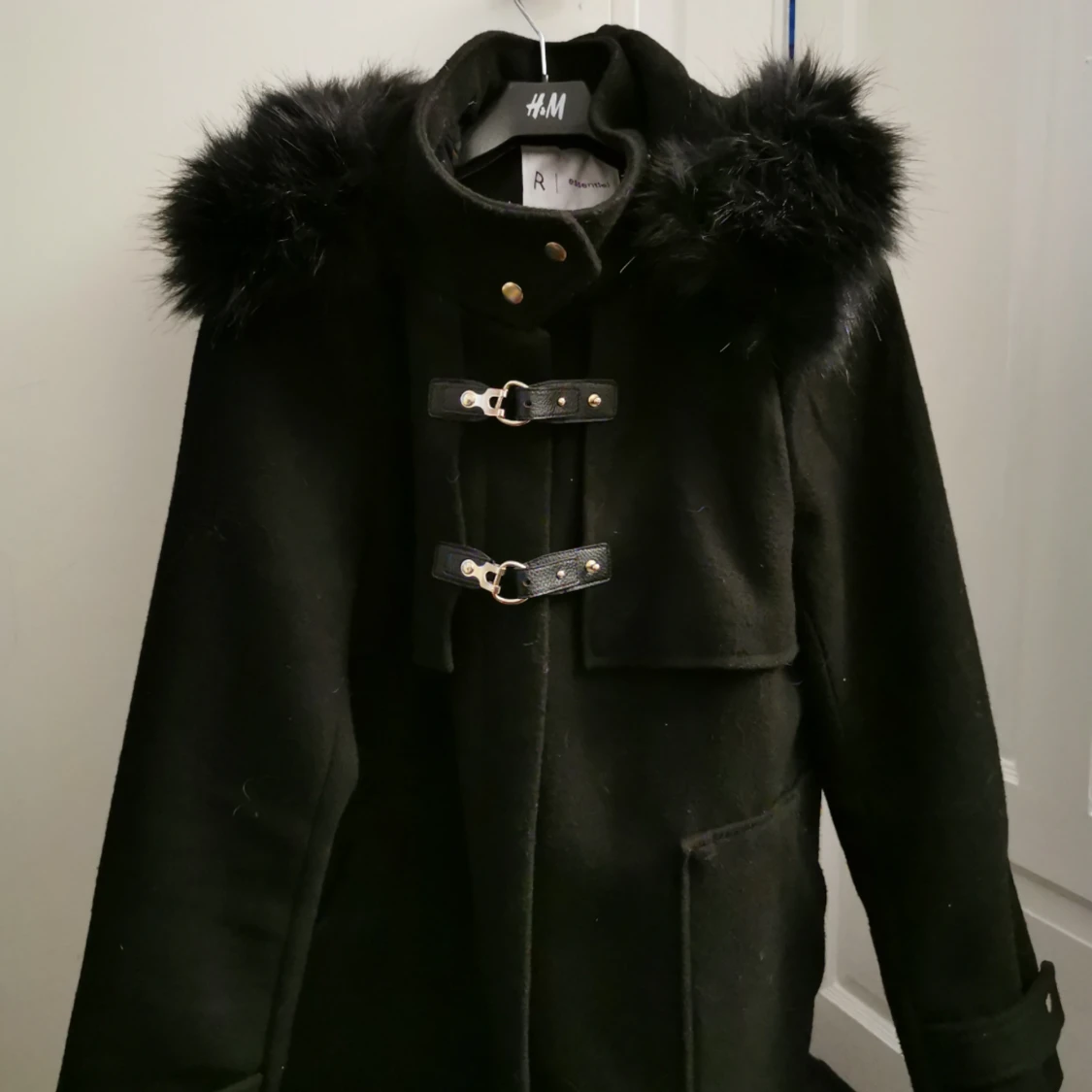 En svart kappa som går ner till rumpan. Stor huva.. Höst jacka