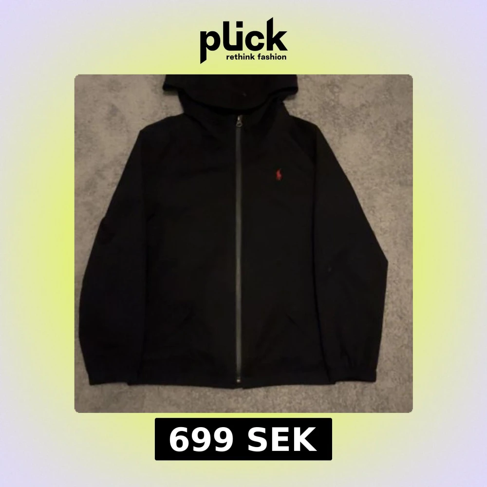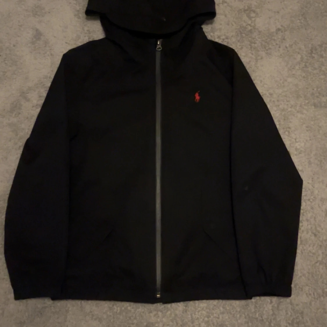 Säljer en stilren svart jacka från Ralph Lauren med dragkedja och huva. Jackan har en liten röd logga på bröstet och långa ärmar. Perfekt för en casual look.