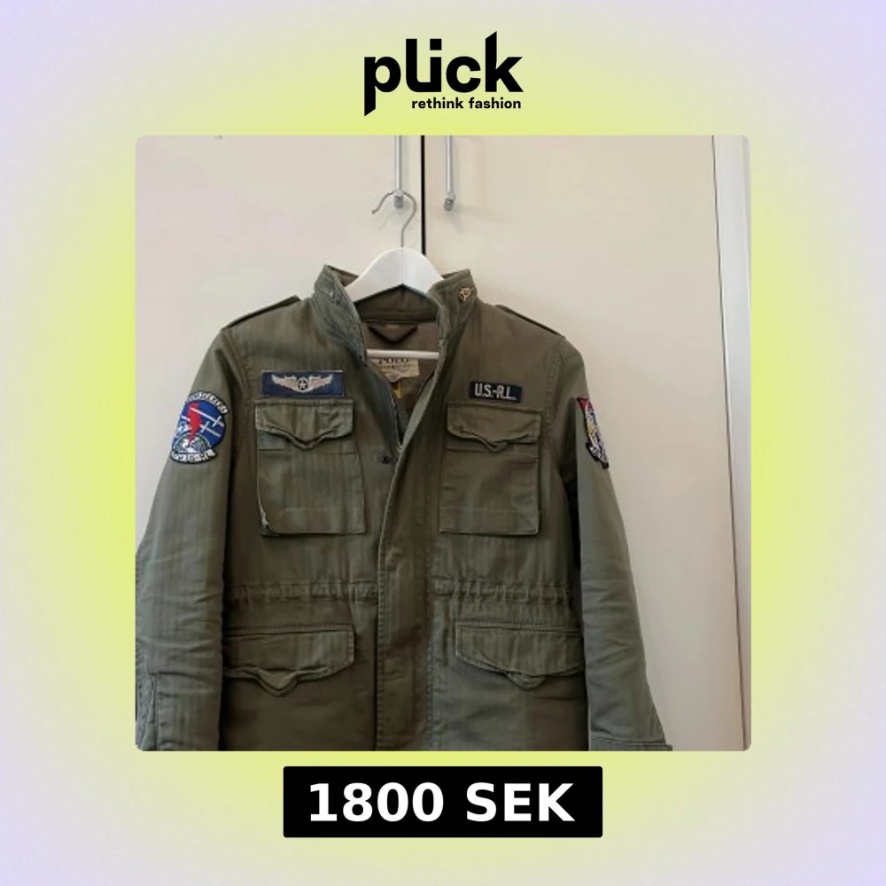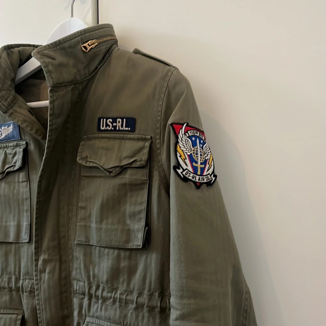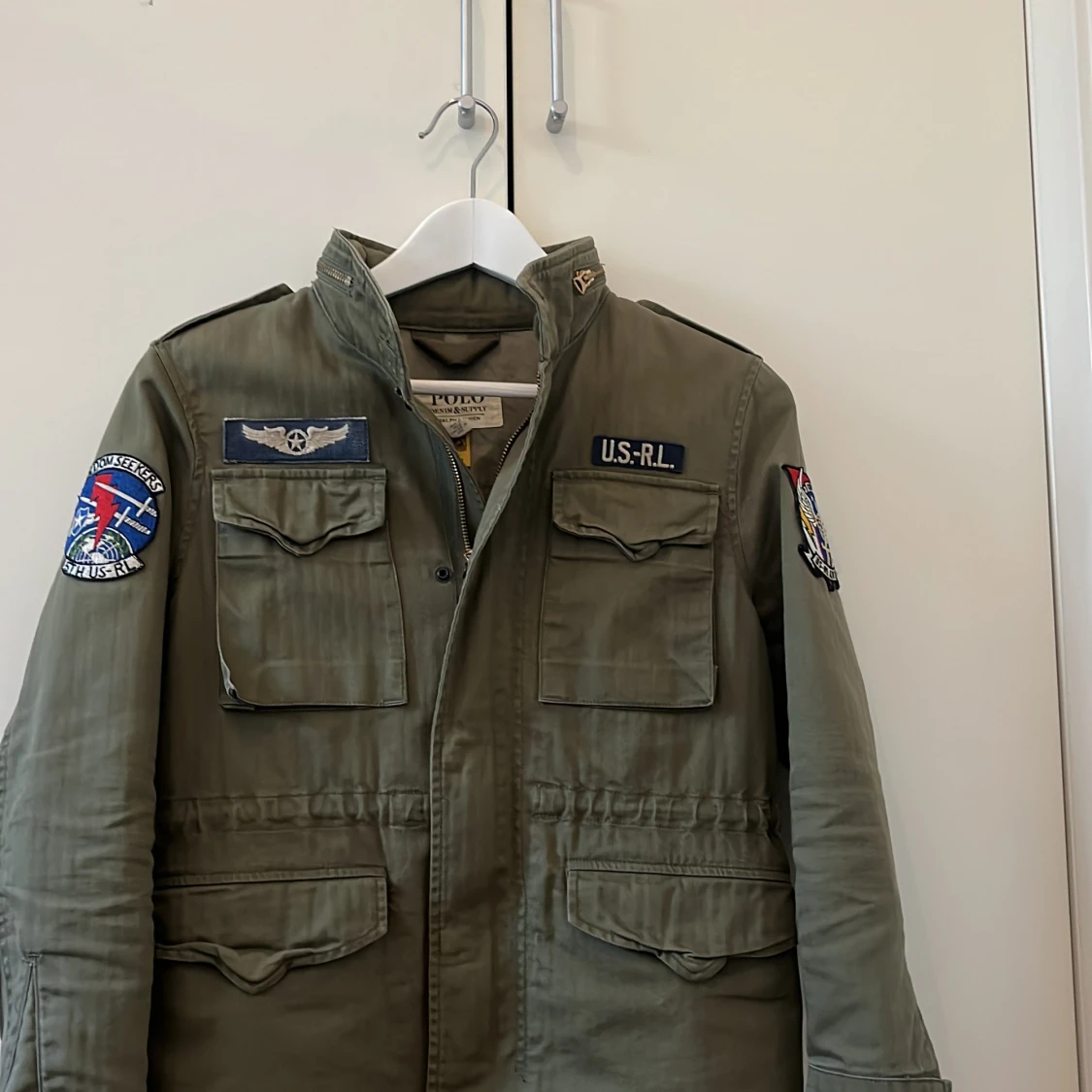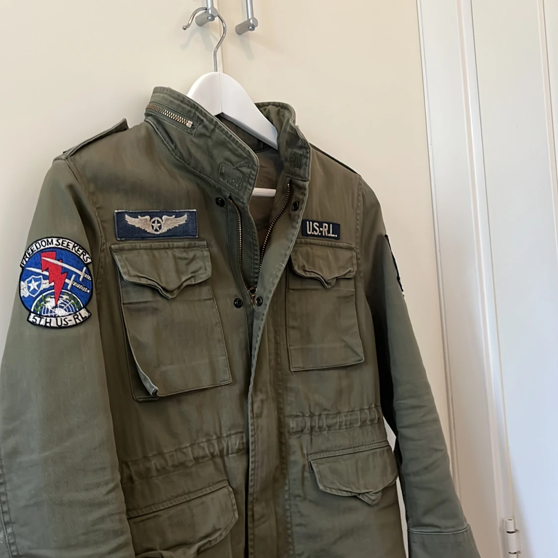 Säljer en olivgrön parkajacka från Polo Ralph Lauren med coola broderade patches på ärmarna och bröstet. Jackan har fyra stora fickor framtill, ståkrage med dragkedjedetalj och U.S.R.L.-märke. Perfekt för dig som gillar militärinspirerad stil.