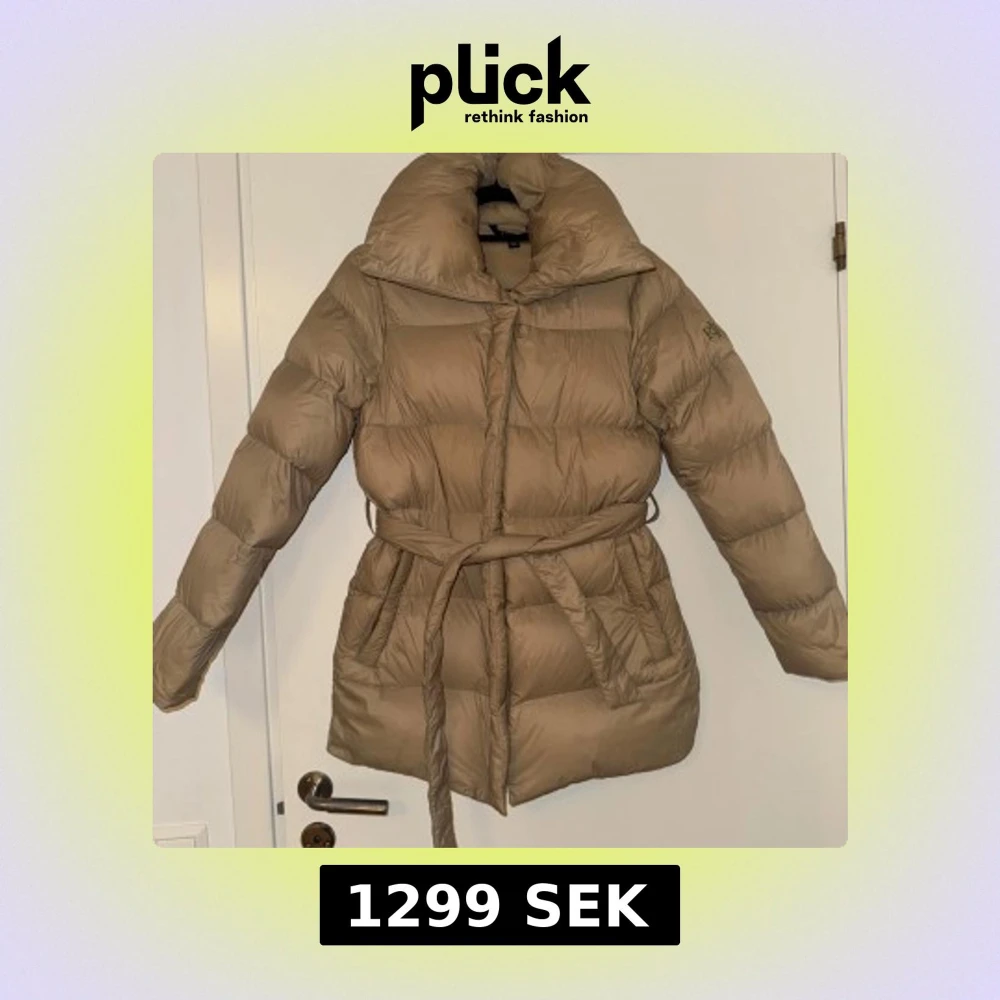 Säljer en stilren beige dunjacka med bälte i midjan. Jackan har en hög krage och långa ärmar, perfekt för kyliga dagar. Den är quiltad och har en klassisk look som passar till det mesta.