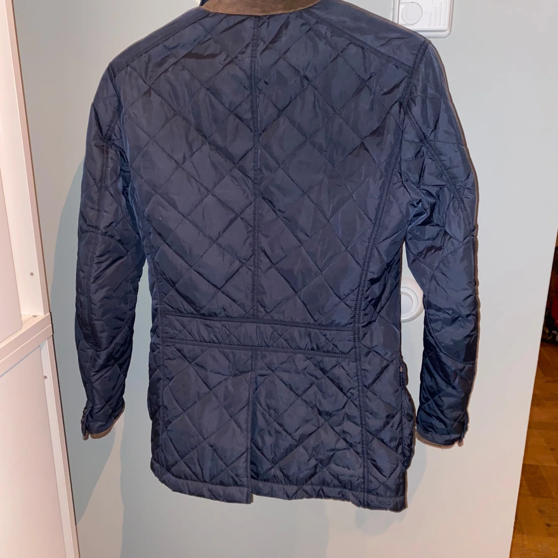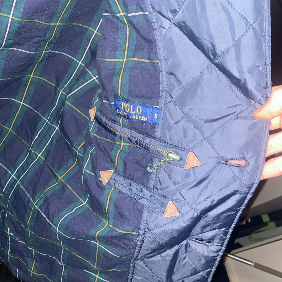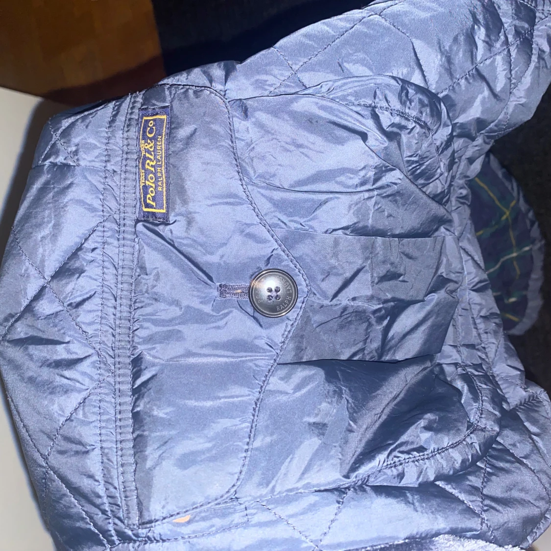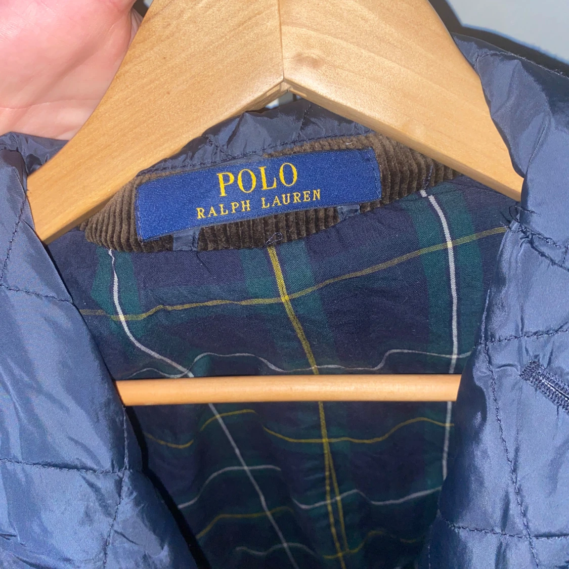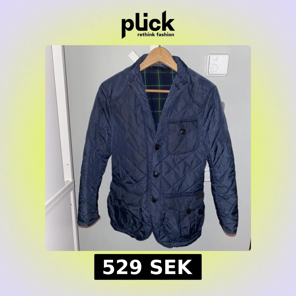 Snygg mörk blå field jacket från Polo Ralph Lauren med klassisk design. Jackan har knappar framtill och en stilren krage. Insidan är fodrad med ett rutigt mönster i grönt och mörkblå. Perfekt för en stilren look.