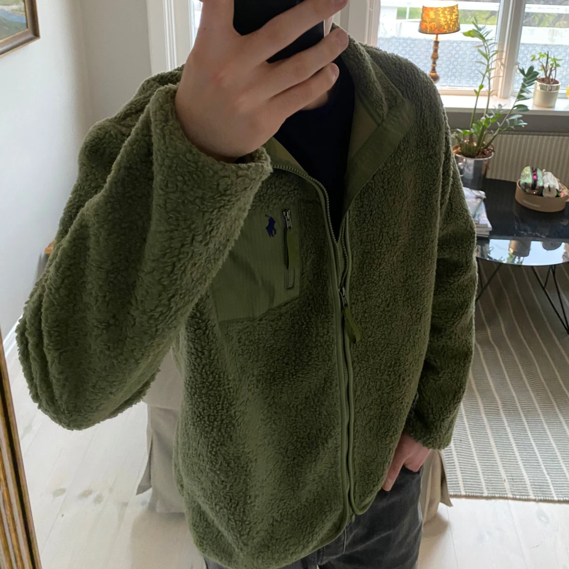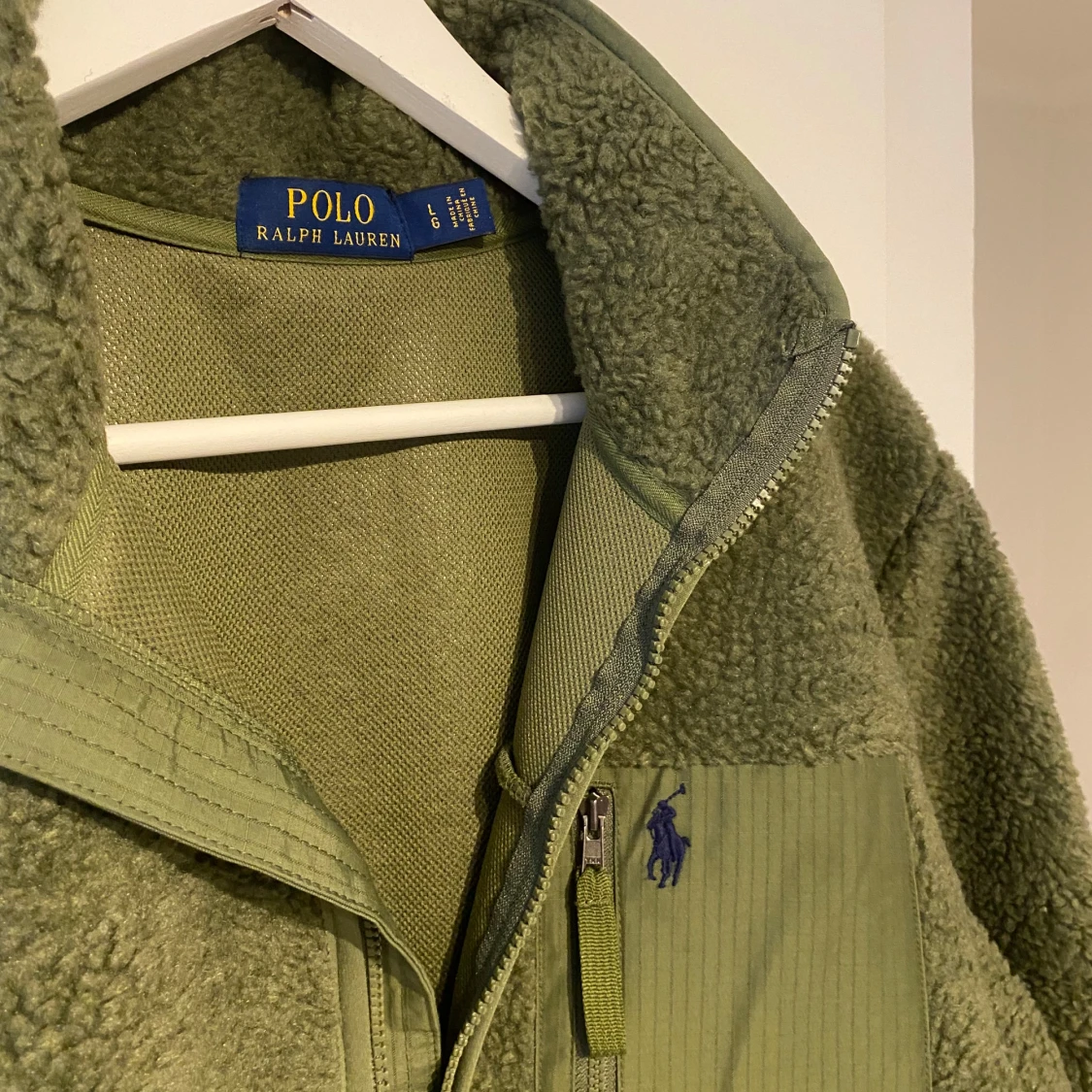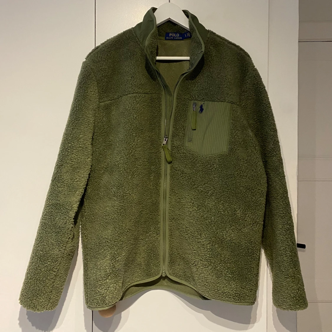 Säljer denna riktigt goa fleecejacka/tröja från Polo Ralph Lauren! Den är i superbra skick, och passar perfekt nu till våren. Färgen är olivgrön/khaki och storleken är L, den sitter ganska true to size! Skriv om ni har frågor eller prisförslag👍