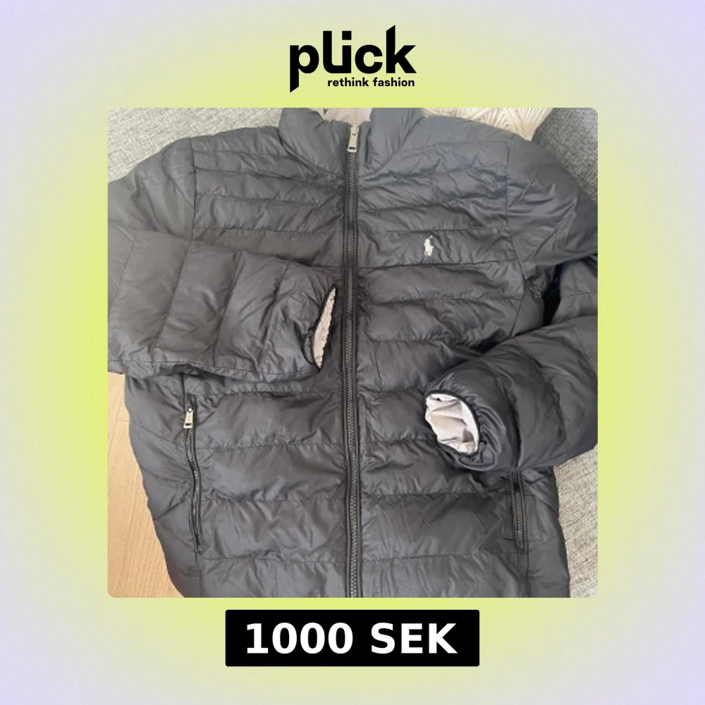 Säljer en vändbar pufferjacka från Polo Ralph Lauren i storlek XL. Ena sidan är svart och den andra är ljusgrå, båda med broderad logga på bröstet. Jackan har dragkedja framtill och två sidofickor med dragkedja.