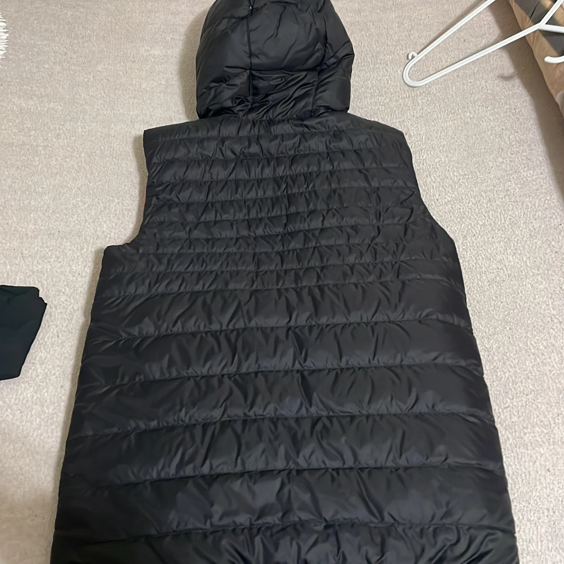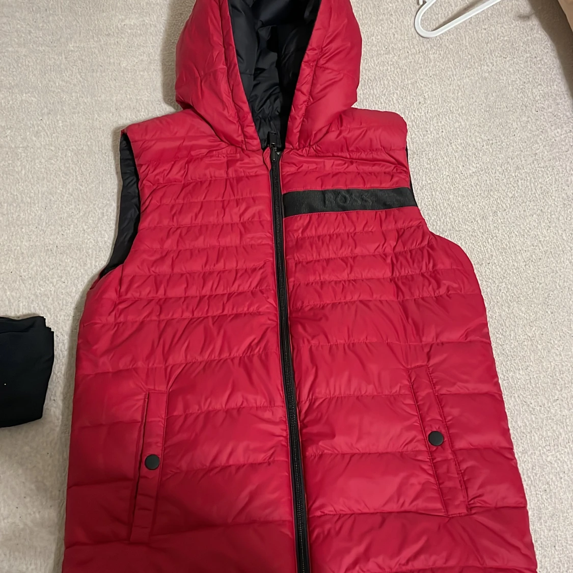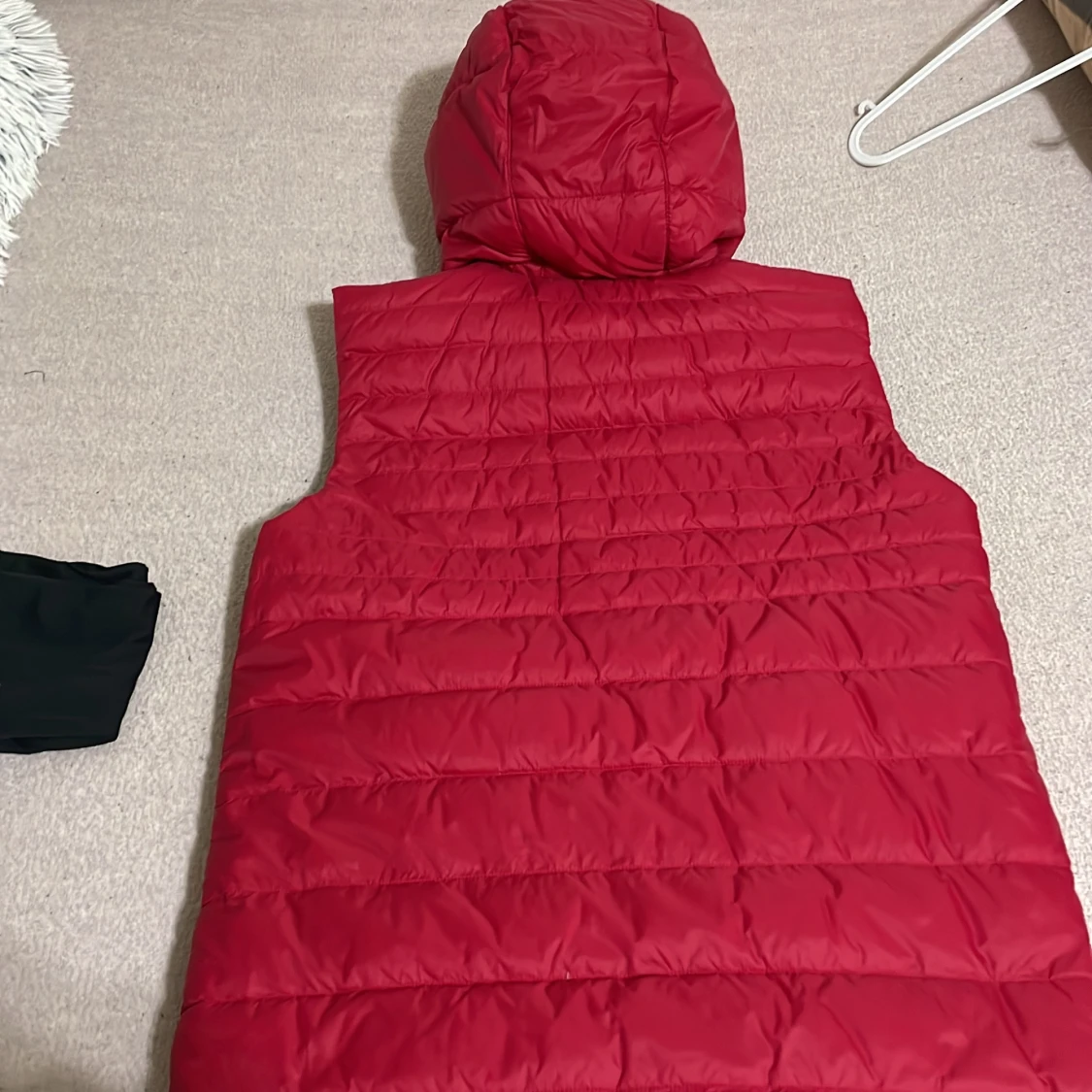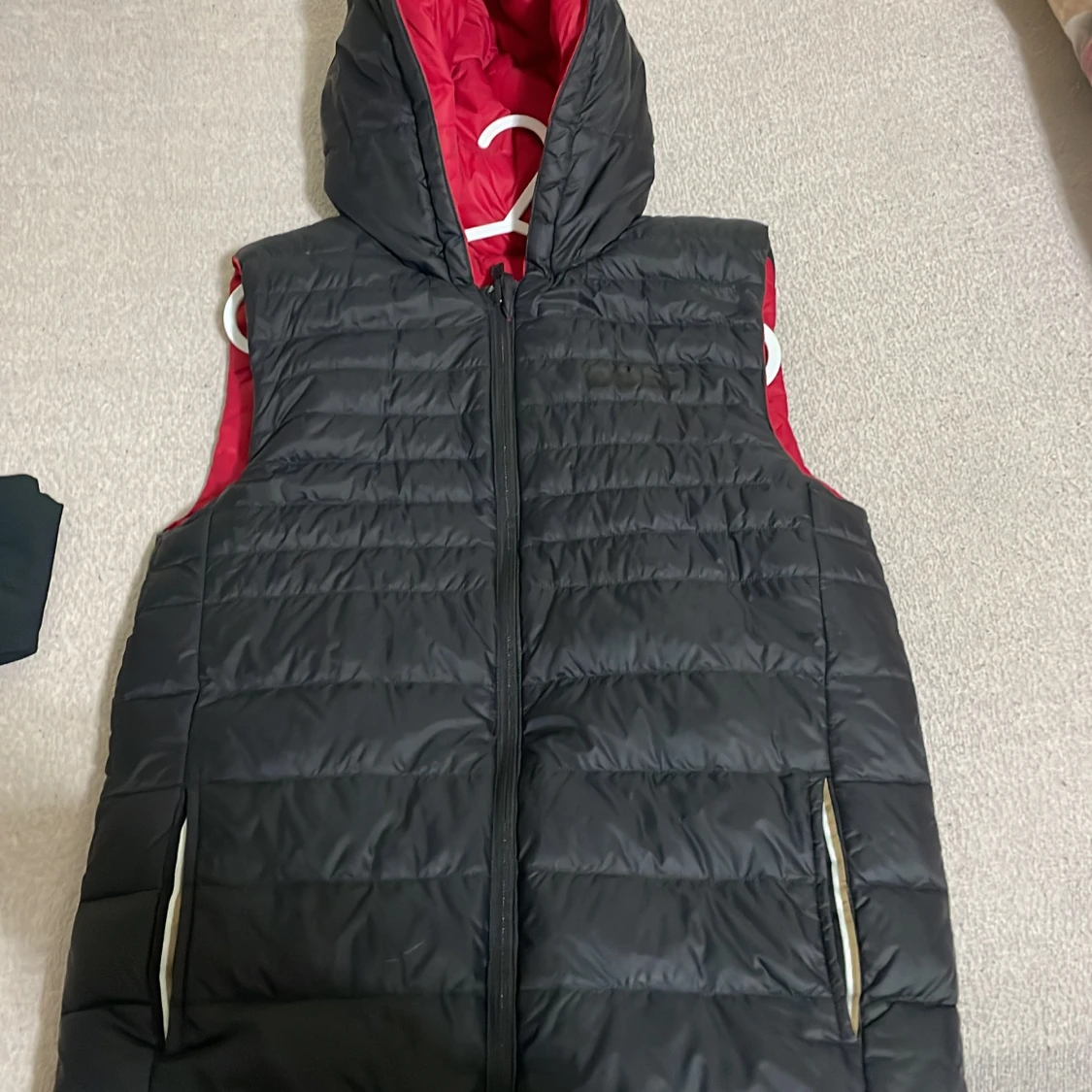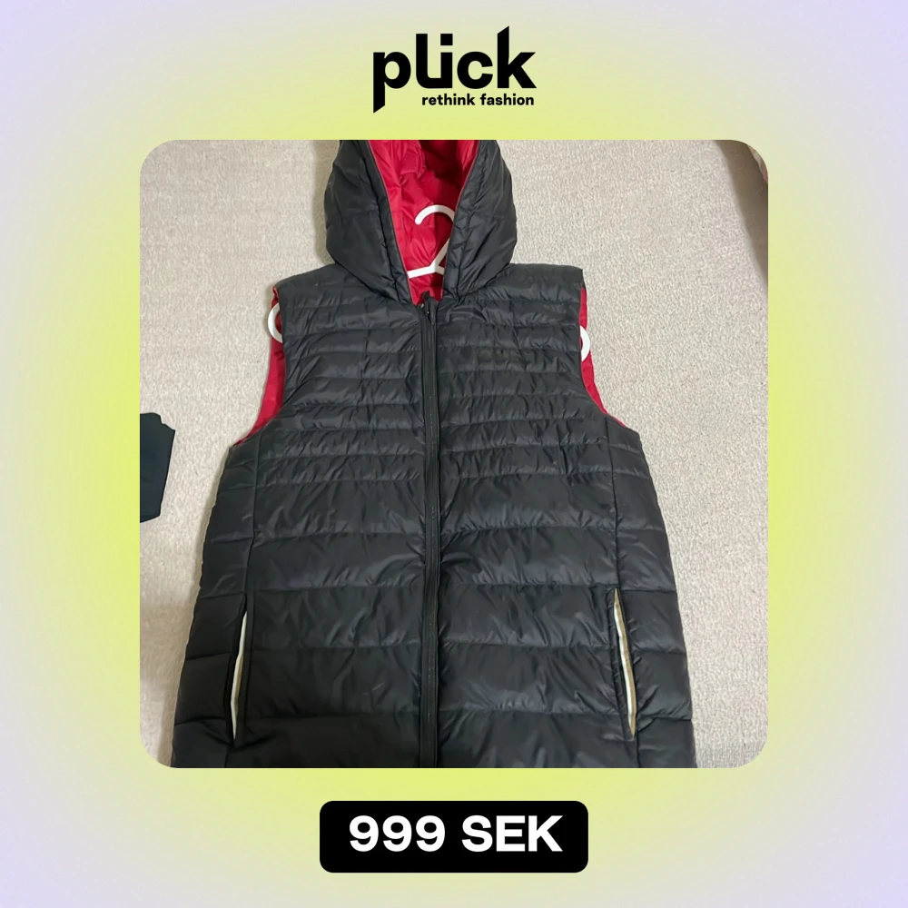 Säljer en snygg vändbar dunväst i svart och rött. Västen har en dragkedja framtill och en praktisk huva. Perfekt för höst och vår när du vill ha lite extra värme utan att bära en jacka. Den är i mycket bra skick och passar till både vardag och träning.