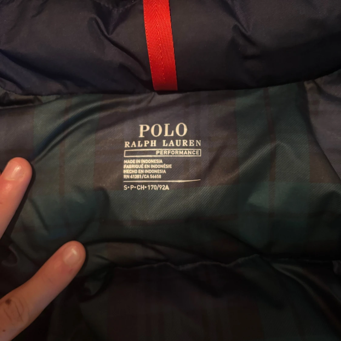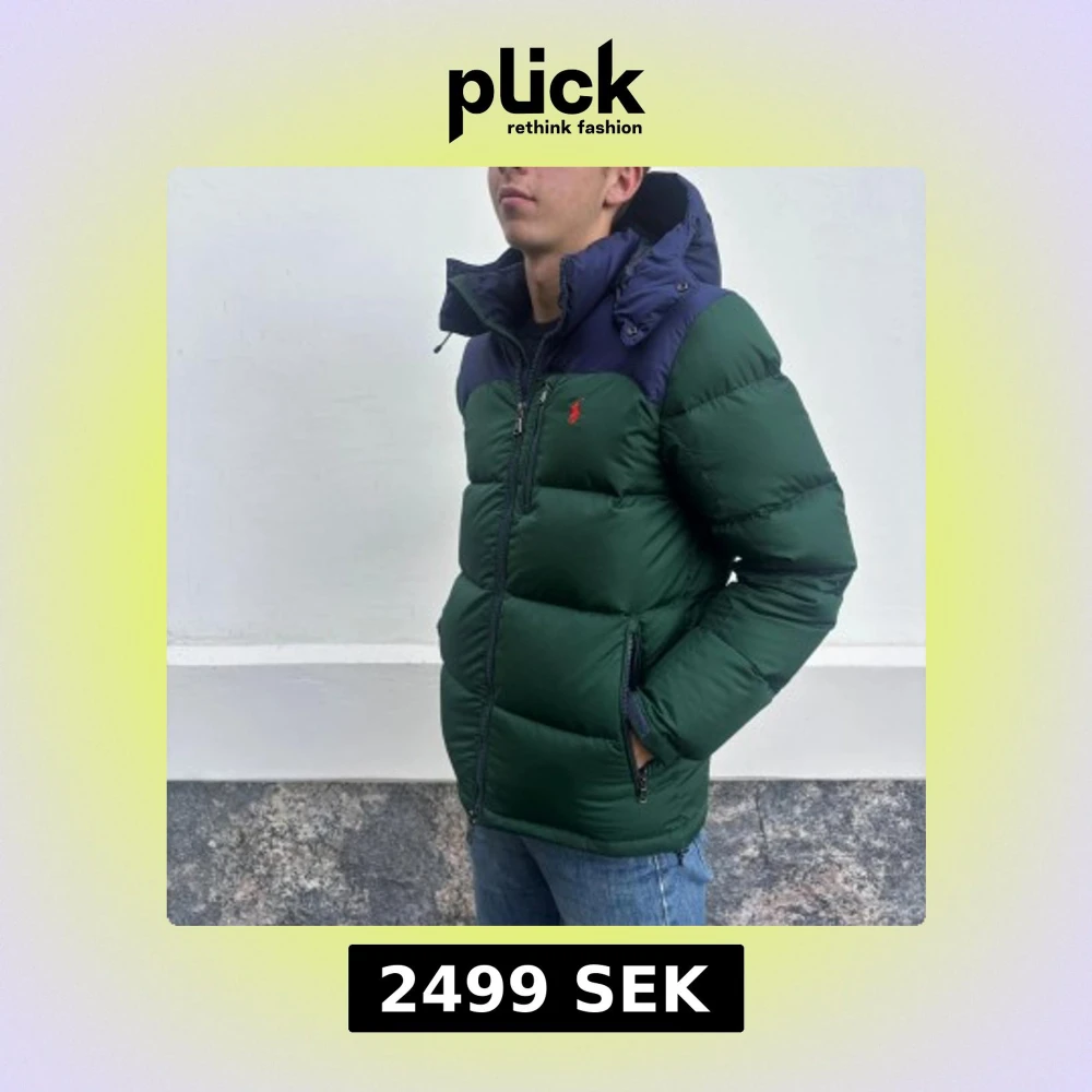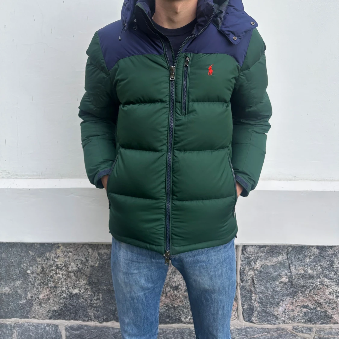 Snygg grön pufferjacka från Polo Ralph Lauren med mörkblå axelparti och huva. Jackan har dragkedja framtill, två fickor med dragkedja och röd broderad logga på bröstet. Perfekt för kalla dagar och riktigt skön att bära.