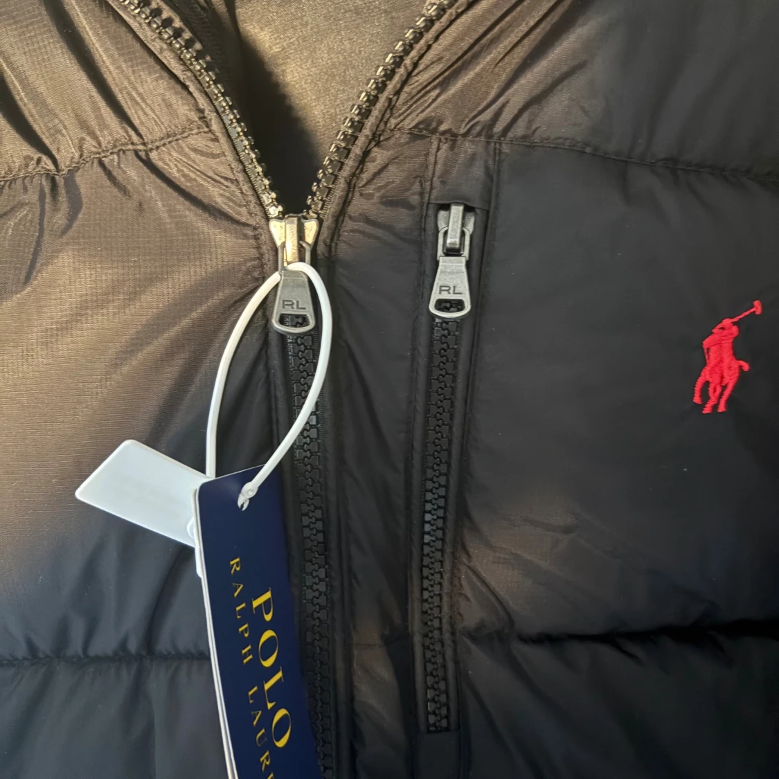 Svart pufferjacka från Polo Ralph Lauren med röd broderad logga på bröstet. Jackan har dragkedja framtill, två sidofickor med dragkedja och hög krage. Den är helt ny men priset kan diskuteras !!❤️