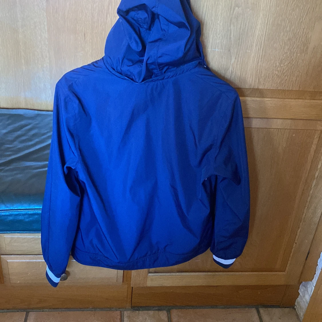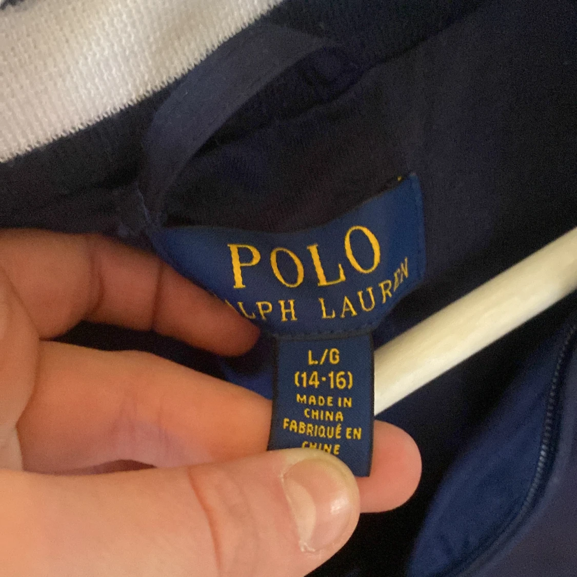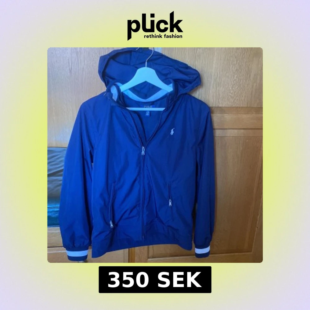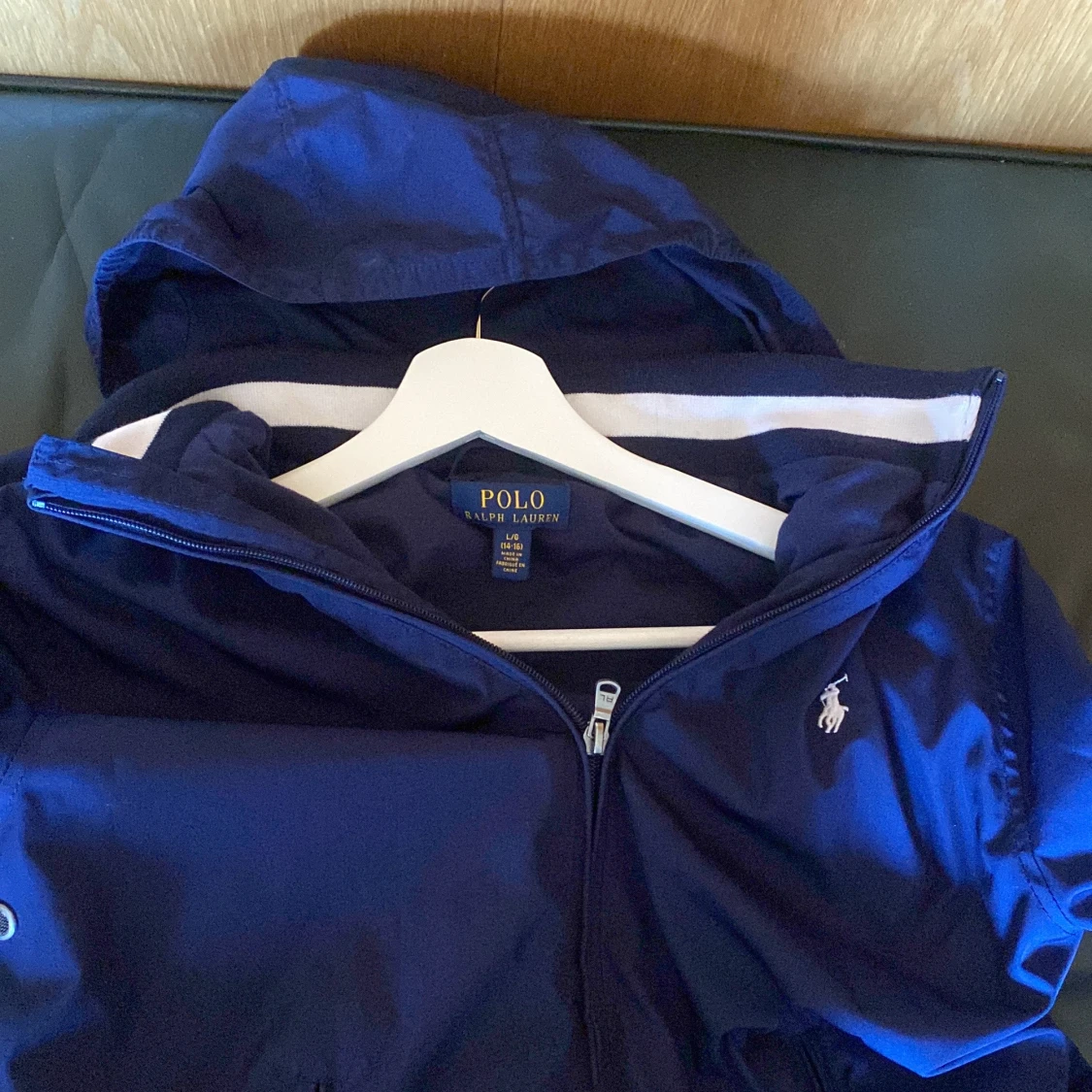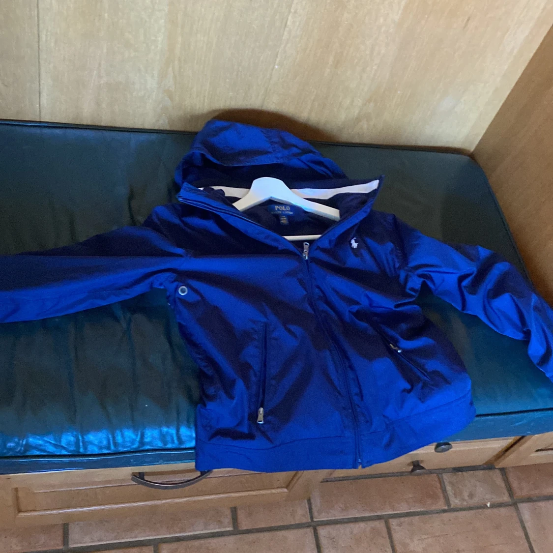 Säljer en snygg blå vindjacka från Polo Ralph Lauren. Jackan har en praktisk huva och dragkedja framtill. Den är perfekt för blåsiga dagar och har ribbade muddar vid ärmsluten. En klassisk logga pryder bröstet.