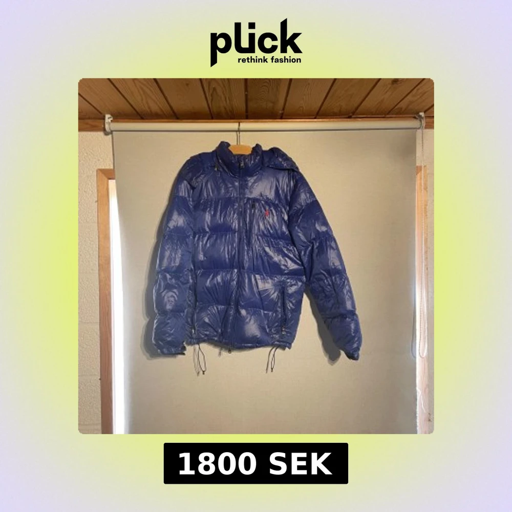 Säljer en blå dunjacka från Polo Ralph Lauren med huva och dragkedja. Jackan har en klassisk pufferstil, och en liten röd logga på bröstet. Perfekt för kalla dagar, använd men i bra skick.