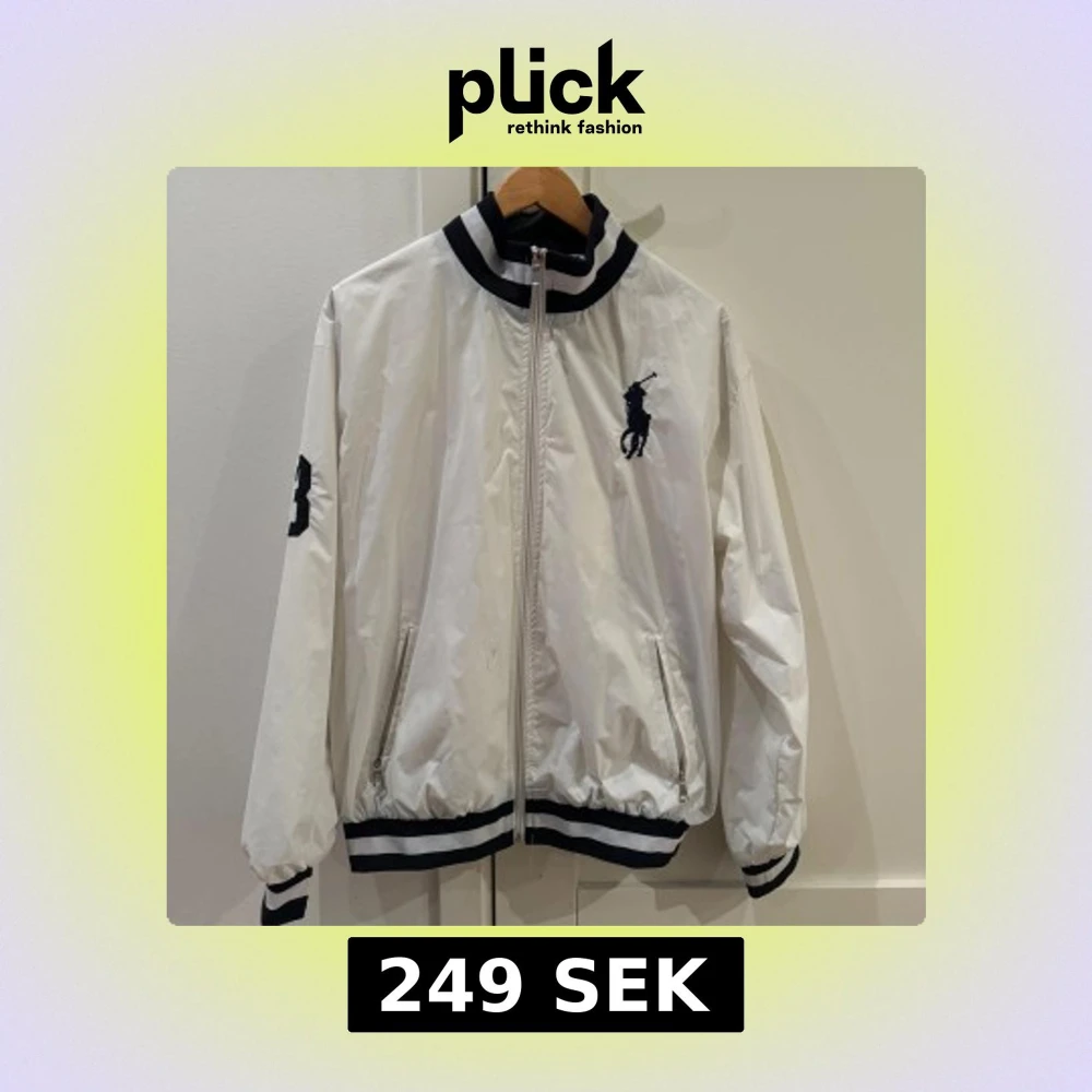 Snygg vit vindjacka från Ralph Lauren med dragkedja och broderad logga på bröstet. Jackan har långa ärmar och ribbade muddar i svart och vitt vid ärmslut och nederkant. Perfekt för en stilren look.