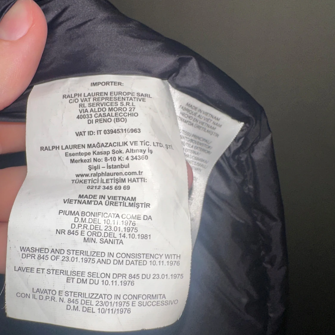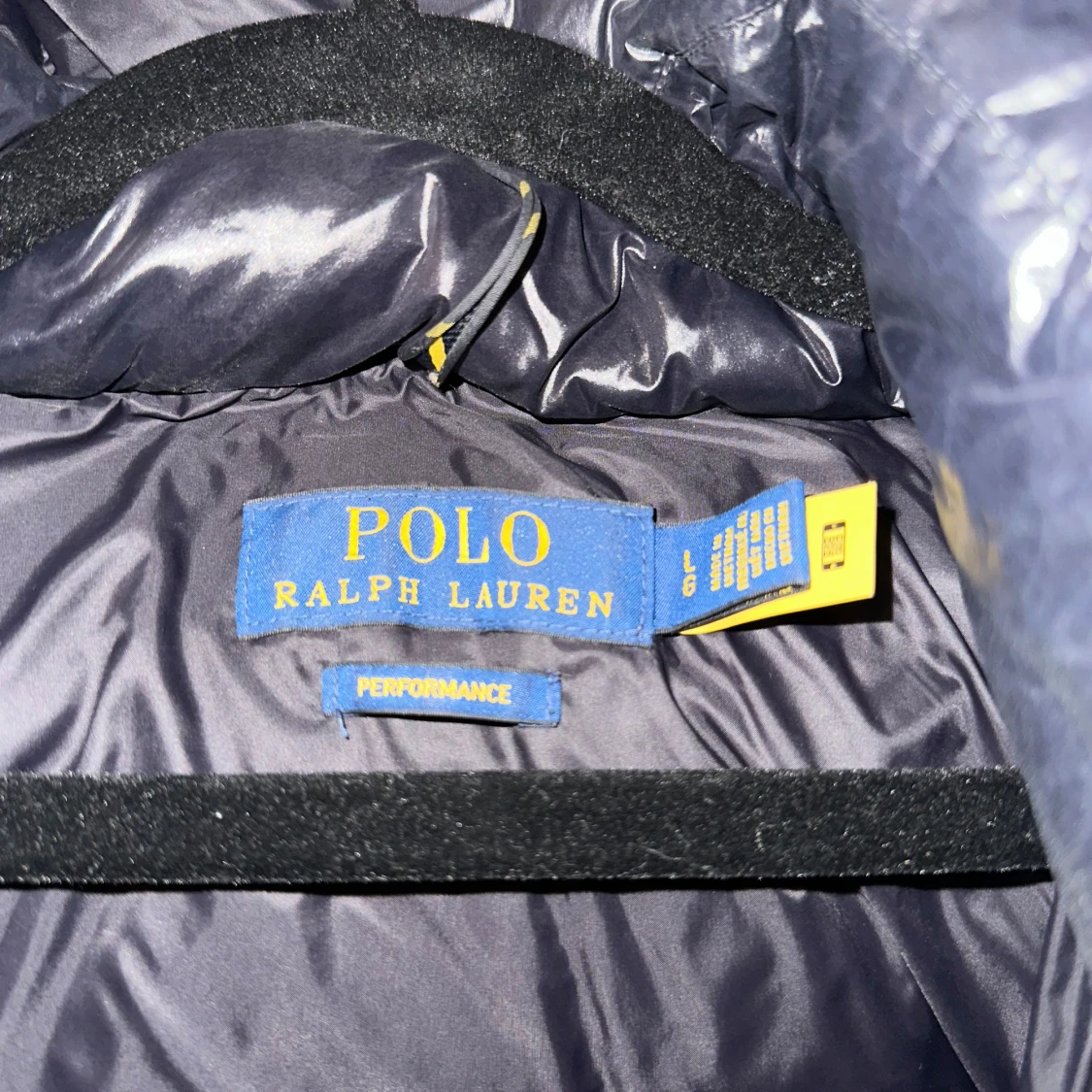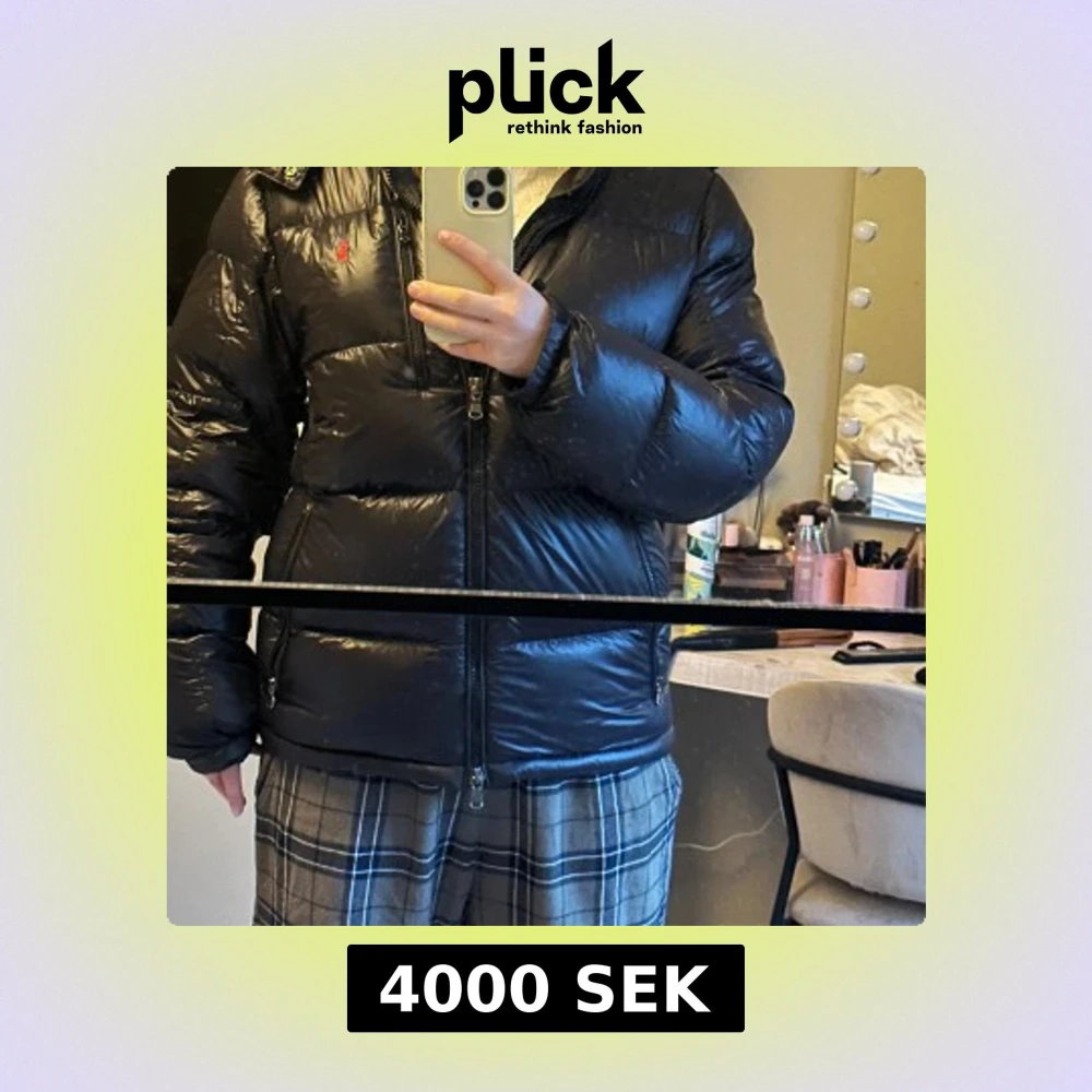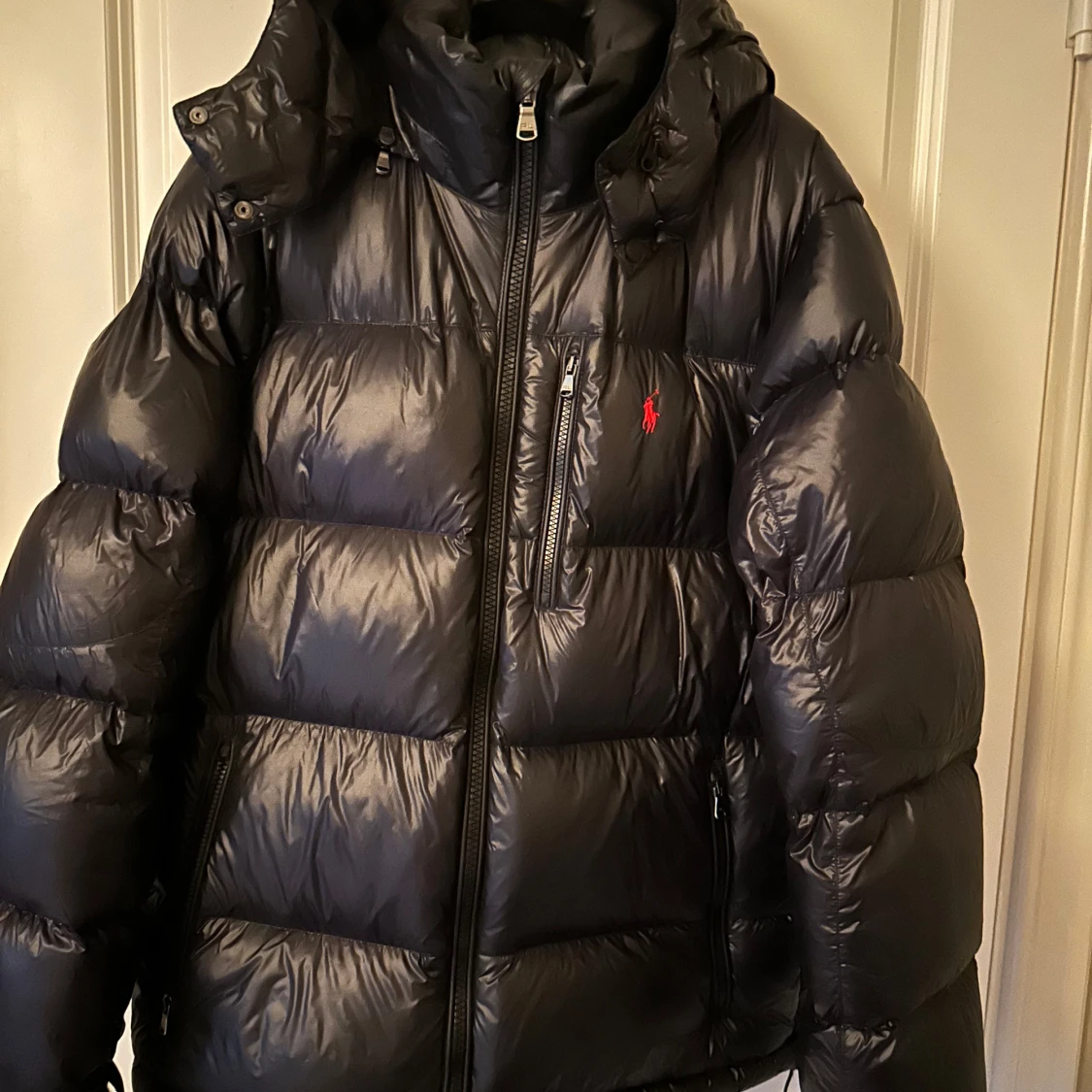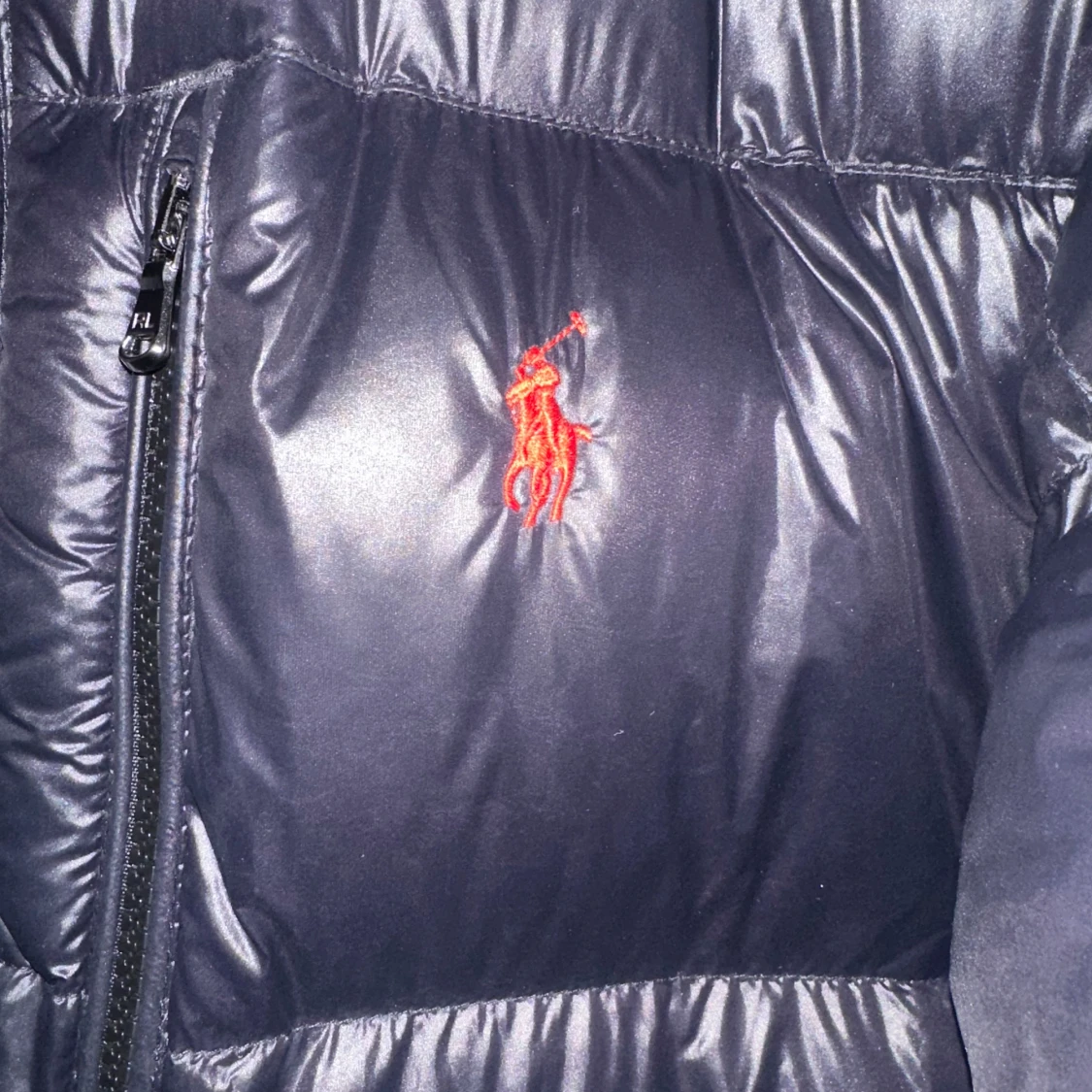 Säljer en svart, glansig dunjacka från Polo Ralph Lauren med röd broderad logga på bröstet. Jackan har dragkedja framtill, flera fickor med dragkedja och en hög krage. Perfekt för kalla dagar och har en riktigt snygg, puffig look.