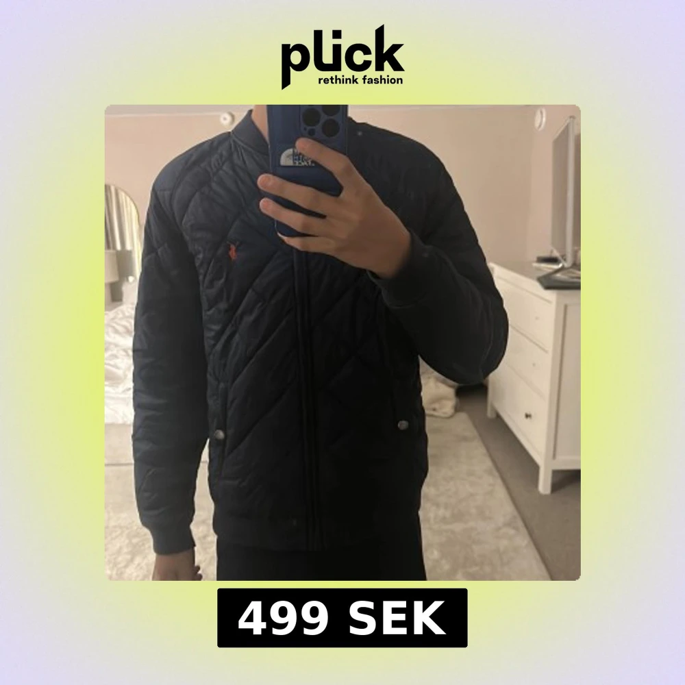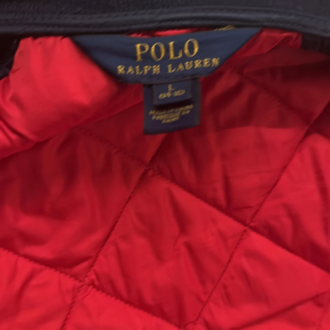 Quiltad blå jacka från Polo Ralph Lauren med röd insida och klassisk logga på bröstet. Jackan har dragkedja framtill, ribbade muddar och diskreta knappar vid fickorna. Perfekt för höst och vinter, stilren och bekväm med snygg passform. Storlek L i barn (14-16)