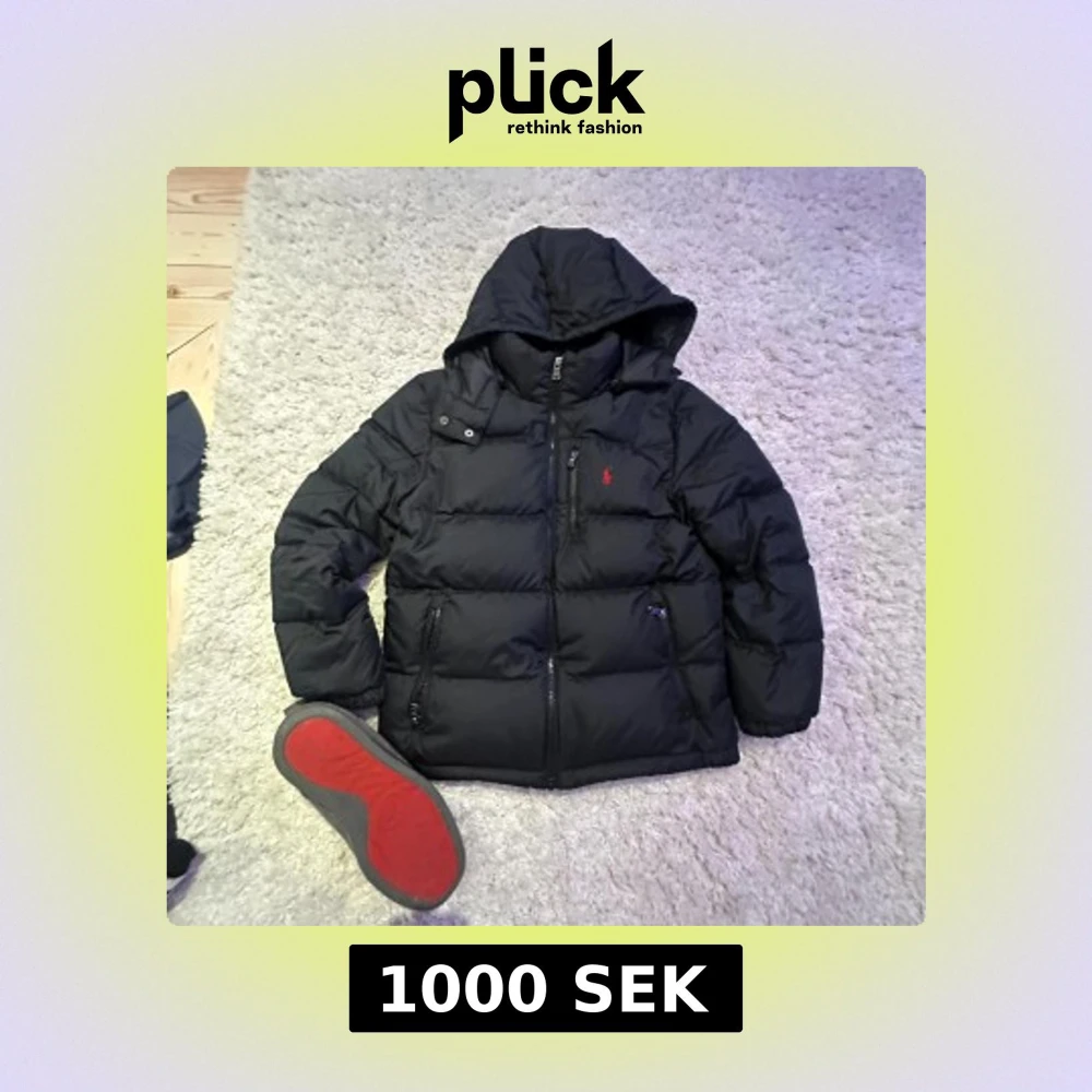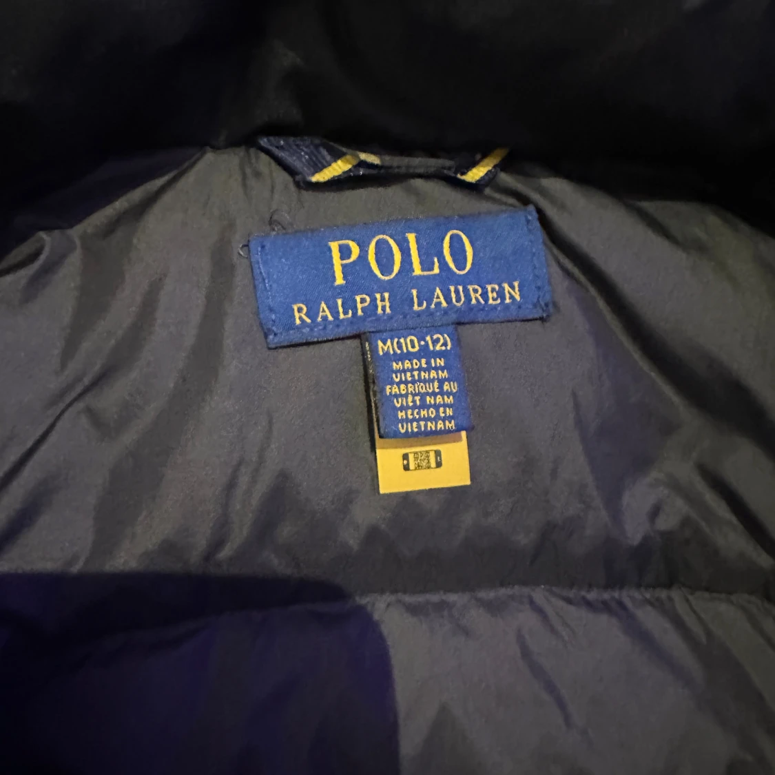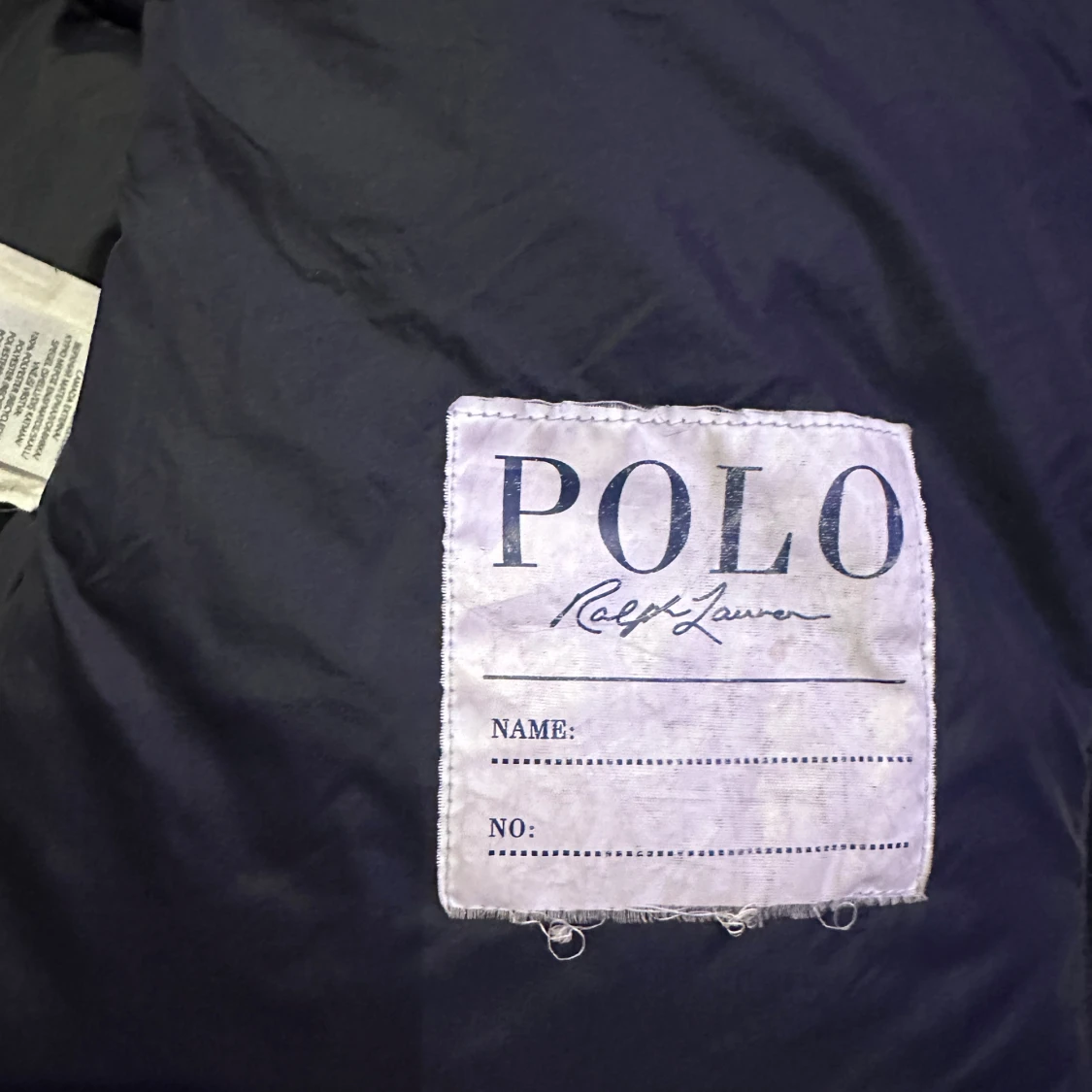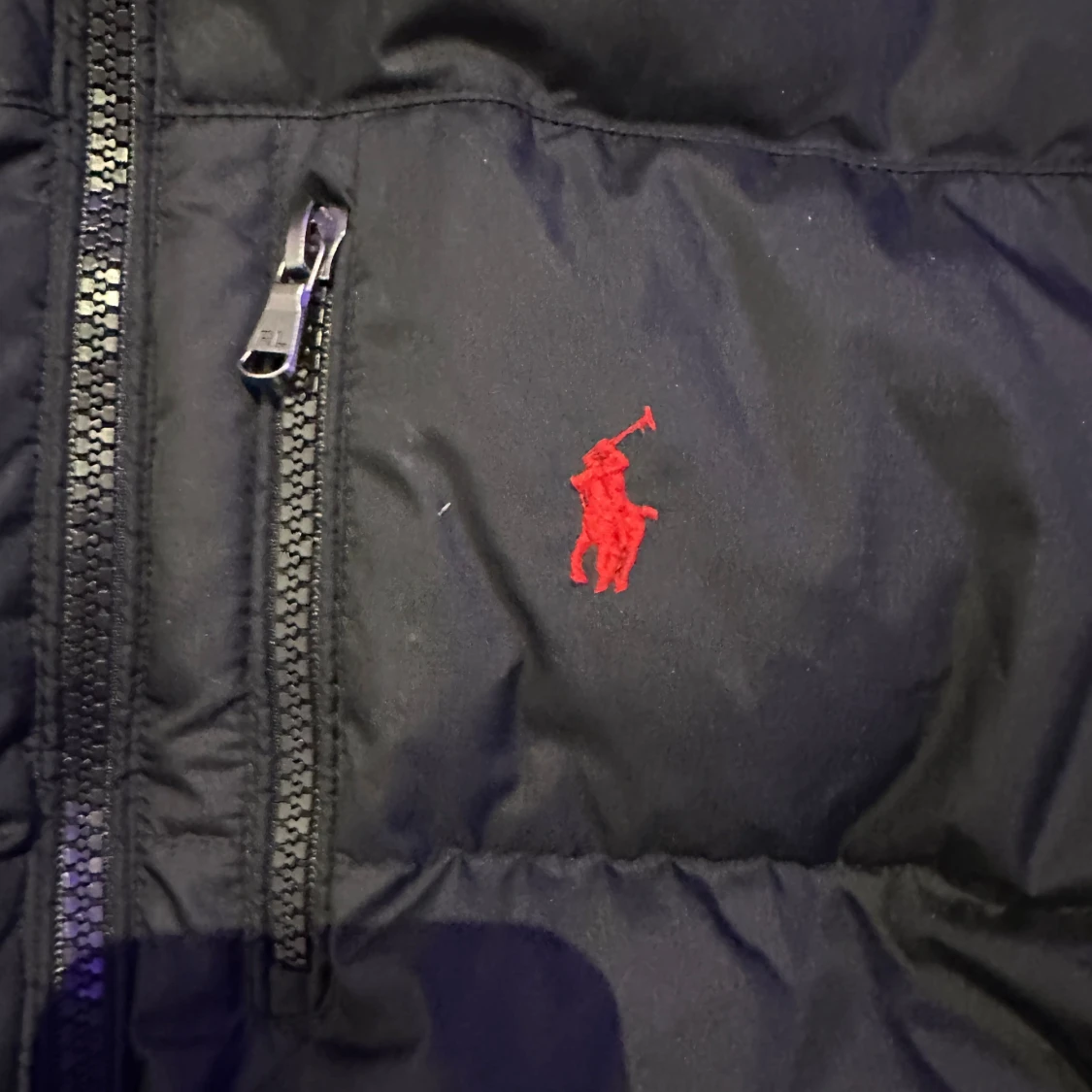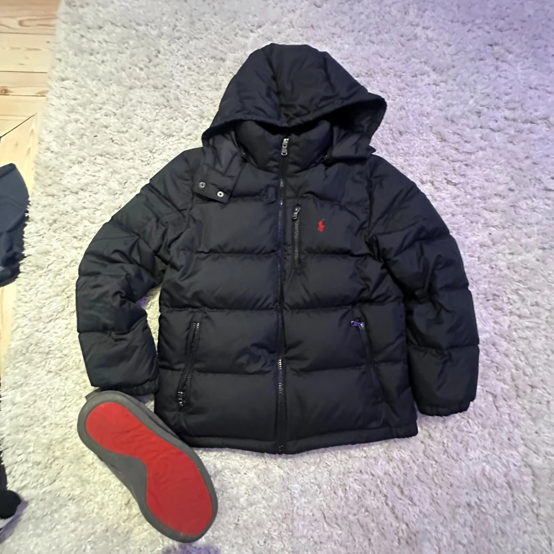 Svart pufferjacka från Polo Ralph Lauren med huva och dragkedja framtill. Jackan har två fickor med dragkedja och ikonisk röd logga på bröstet. Perfekt för kalla dagar med sin vadderade design och klassiska look. Obs kolla storleken det är 10-12 år st M tagen där back är sönder skickar jild på det pv