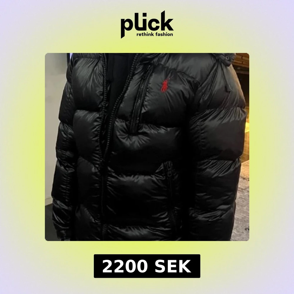 Säljer en svart pufferjacka från Polo Ralph Lauren med röd broderad logga på bröstet. Jackan har huva, flera dragkedjefickor och quiltad design. Materialet är glansigt och känns lyxigt, perfekt för kalla dagar. Stängs med kraftig dragkedja framtill.