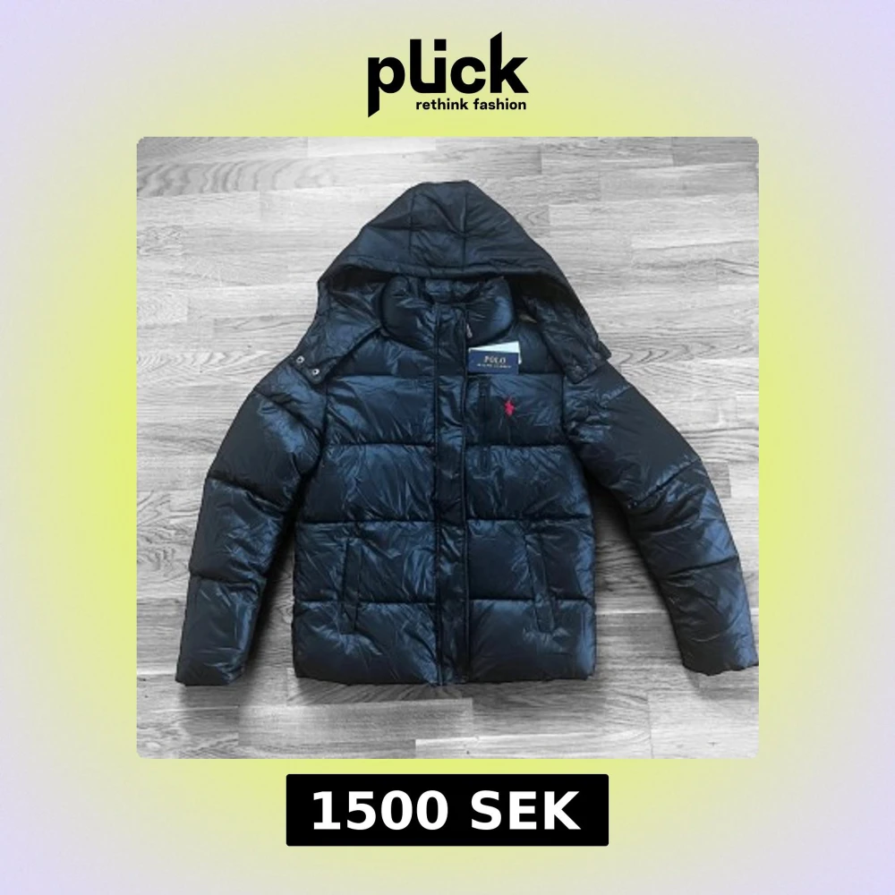 Svart pufferjacka med huva och broderad röd logga på bröstet. Jackan har quiltad design, dragkedja framtill och två sidofickor. Materialet är glansigt och syntetiskt, perfekt för kalla dagar. Klassisk och stilren look. FINNS I STORLEK S OCH M.